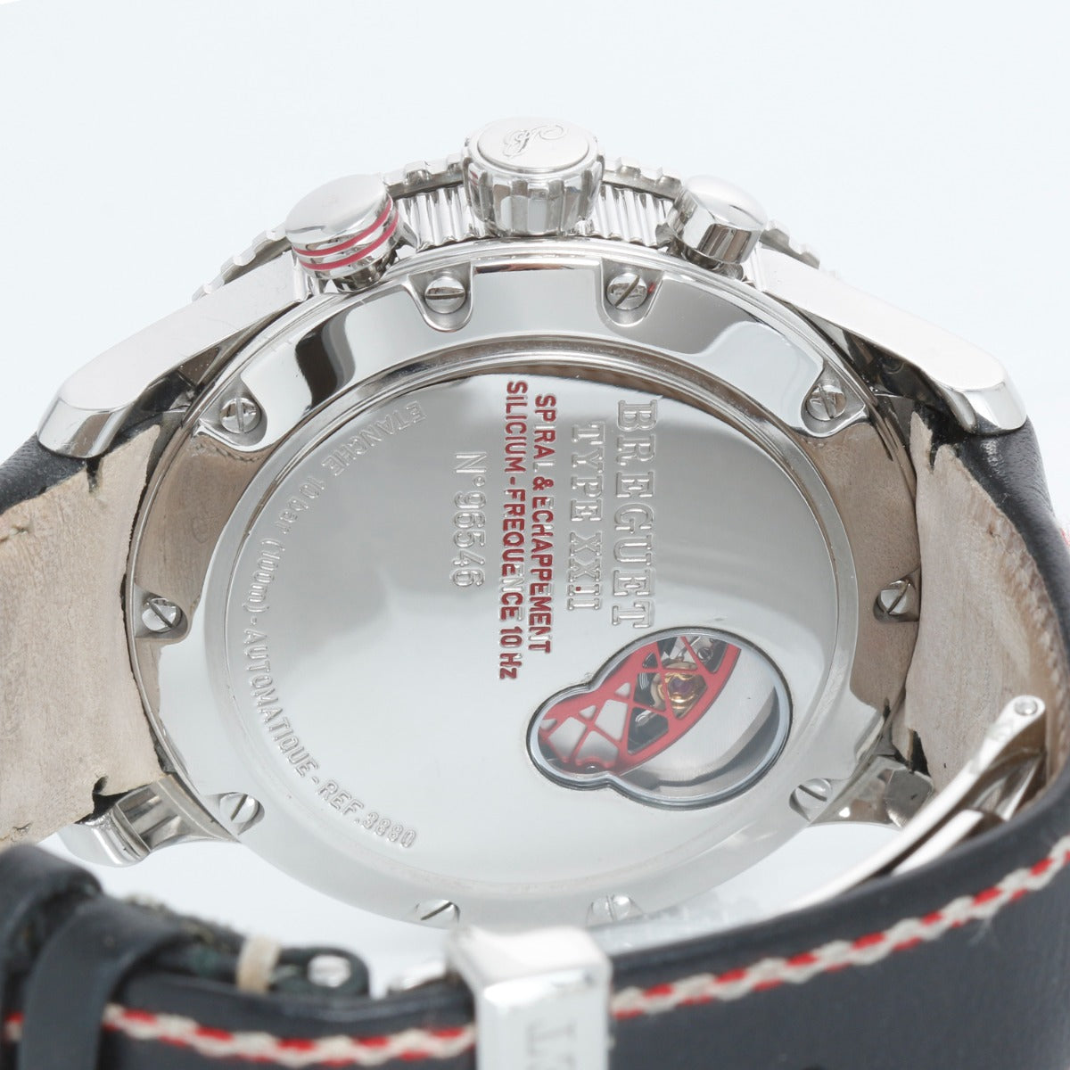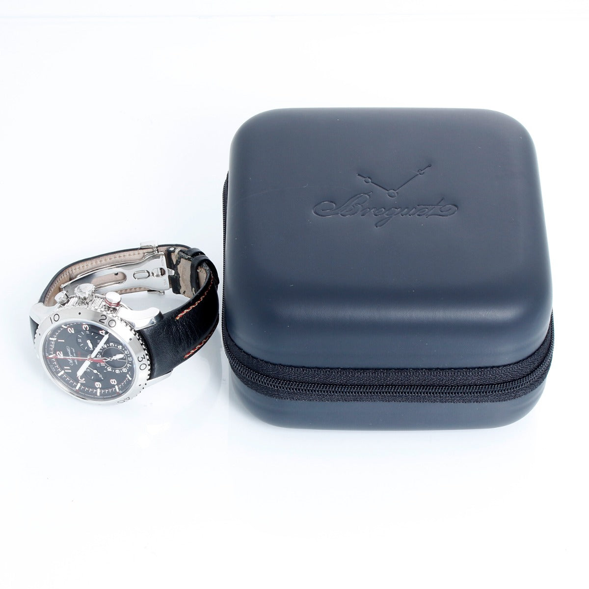 Breguet Type XXII Transatlantique Chrono Men's Watch Ref 3880 - Automatic winding. Stainless Steel ( 44 mm ) Uni-directional rotating bezel. Black dial with luminous hands and Arabic numeral hour markers; Red chronograph marker. Black Breguet leather strap with Stainless Steel deployant buckle and red and white stitching on the band. Pre-owned with Breguet travel box.