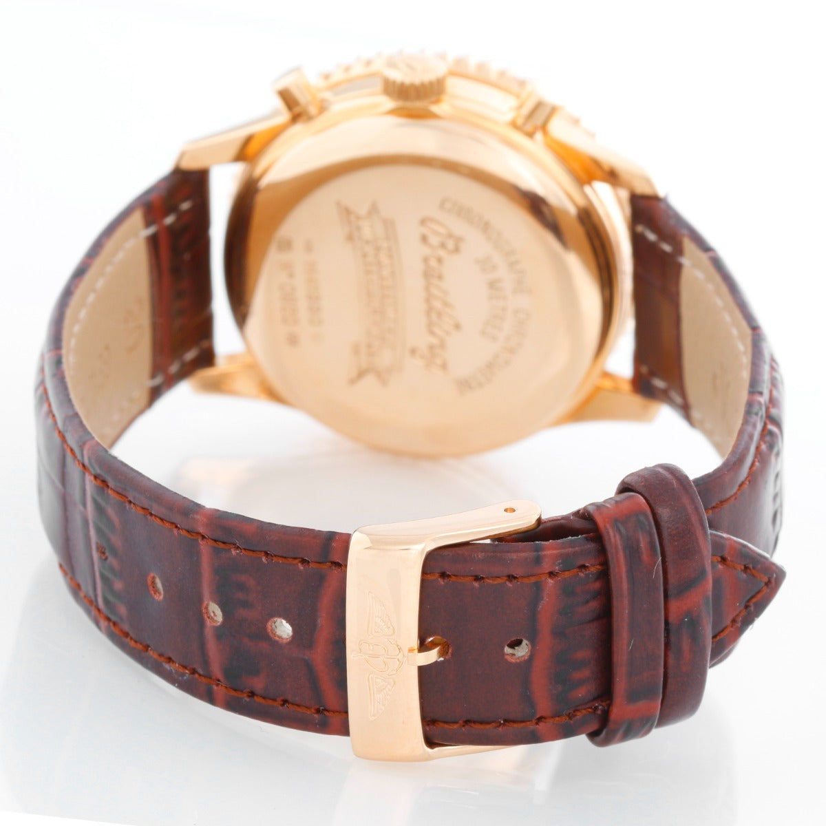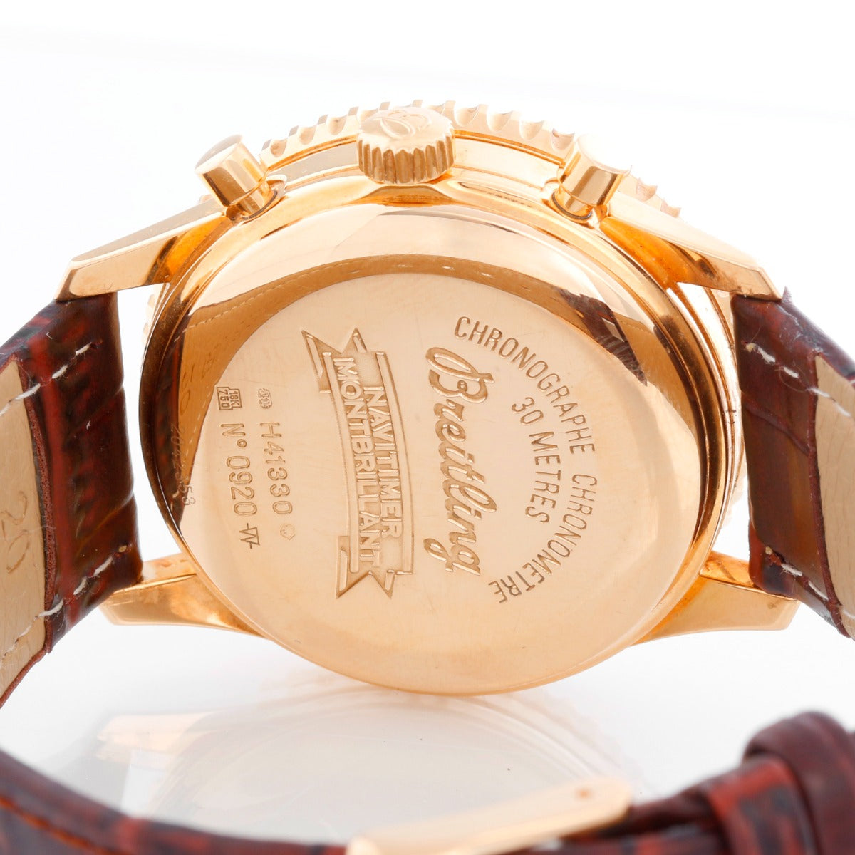 Breitling 18K Yellow Gold Navitimer Montbrillant Chronograph Men's Watch H 41330 - Automatic . 18K Yellwo Gold ( 38 mm ) . Silver dial with sub dials at 3, 6, 9 o'clock . Breitling leather strap with Breitling tang buckle . Pre-owned with Breitling box and books