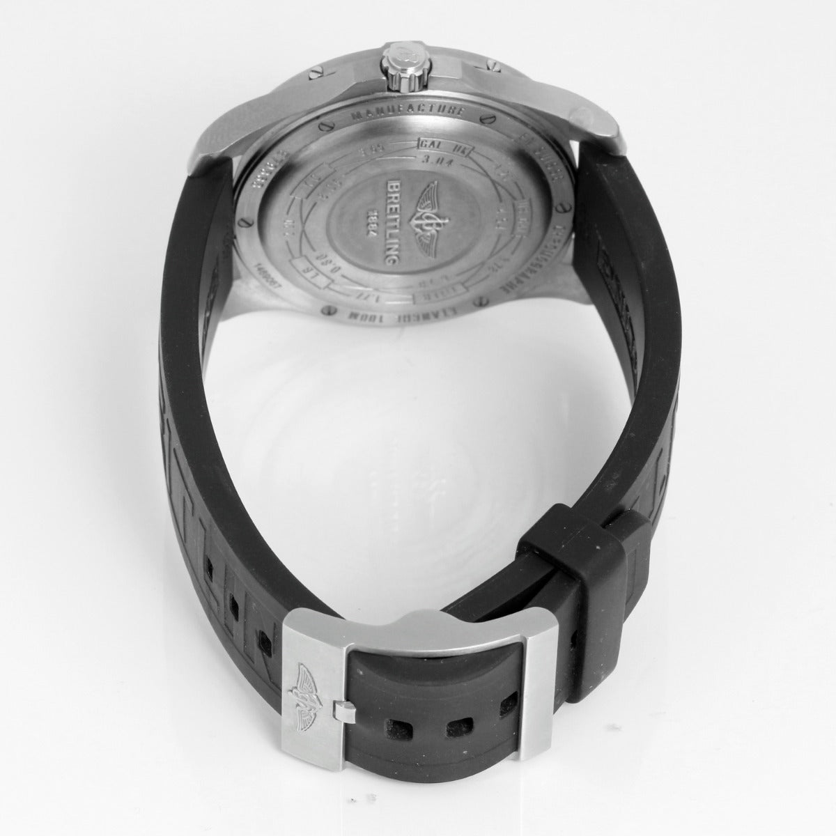 Breitling Aerospace Evo GMT Analog Digital Titanium Men's Watch E7936310/BC27 - Quartz. Titanium case with rotating bezel (43 mm diameter). Luminous Silver Tone Hands and Arabic Numeral Hour Markers with Minute Markers Around the Outer Rim and a Digital Calendar on a Black Dial. Black Breitling rubber strap with Breitling buckle. Pre-owned with Breitling box & papers. Card dated 2014. This watch appears to be New old stock .