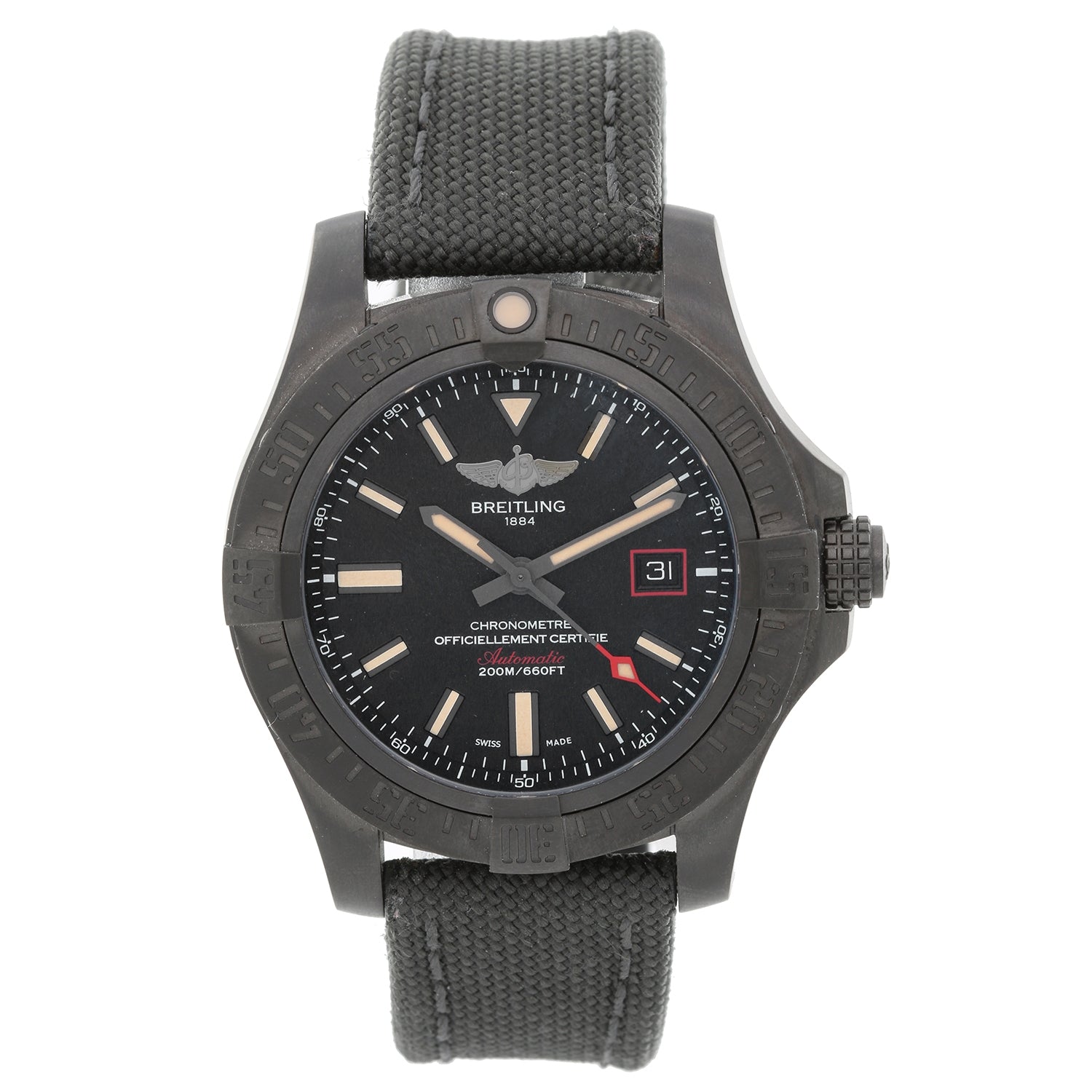 Breitling Avenger Blackbird 44 Men's Watch V1731110/BD74 - Automatic. Brushed black titanium case with rotating bezel (44 mm diameter). Black dial with luminous hour markers and hands; date at 3 o clock. Black Military Canvas strap band with Breitling buckle. Pre-owned with box and papers.