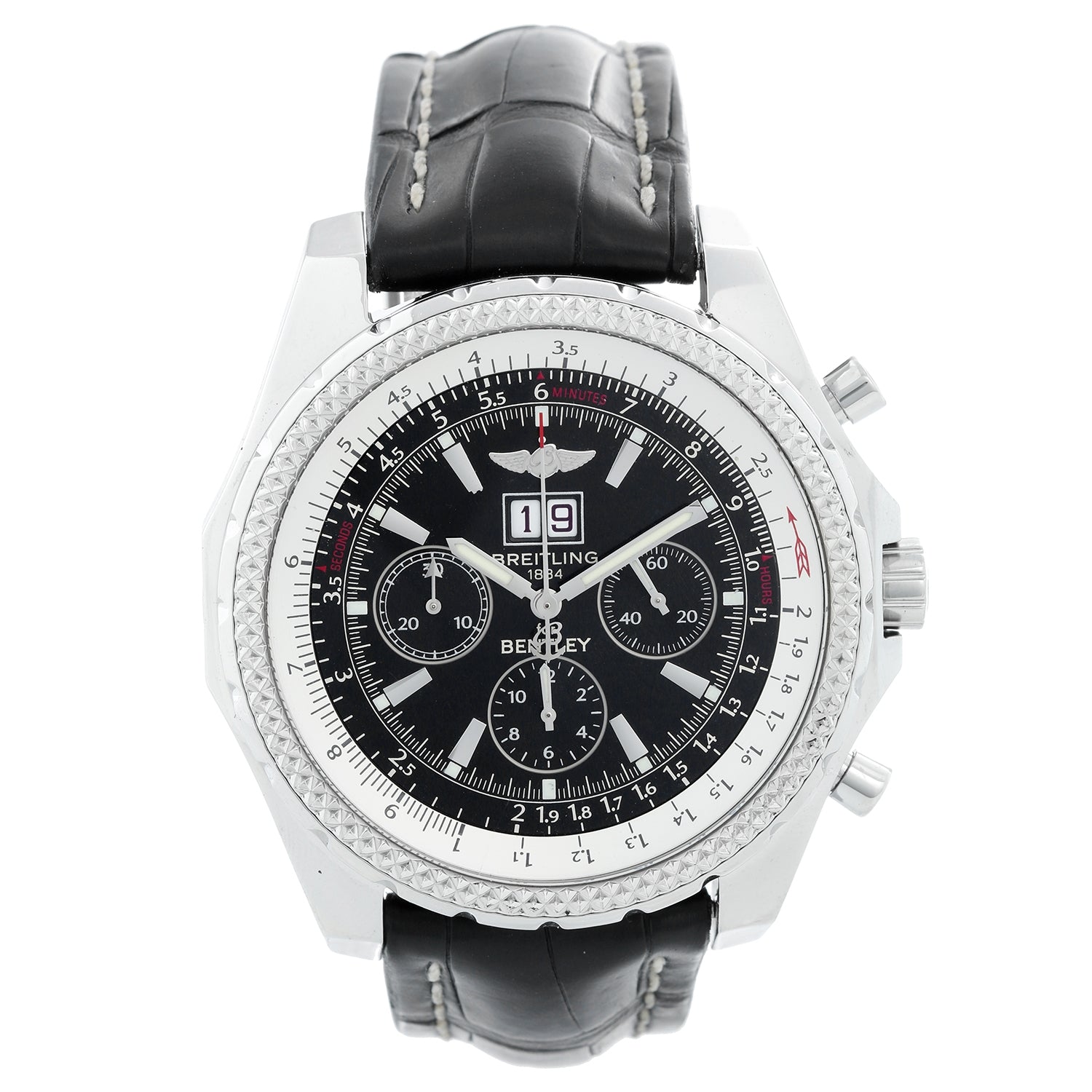 Breitling Bentley Chronograph Men's Steel Watch Black Dial A44362 - Automatic winding chronograph. Stainless steel case with rotating tachymeter bezel (49mm diameter). Black dial with hour, minute and seconds recorders and big date . Black Breitling strap band with white stitching and stainless steel deployant clasp. Pre-owned with custom box .