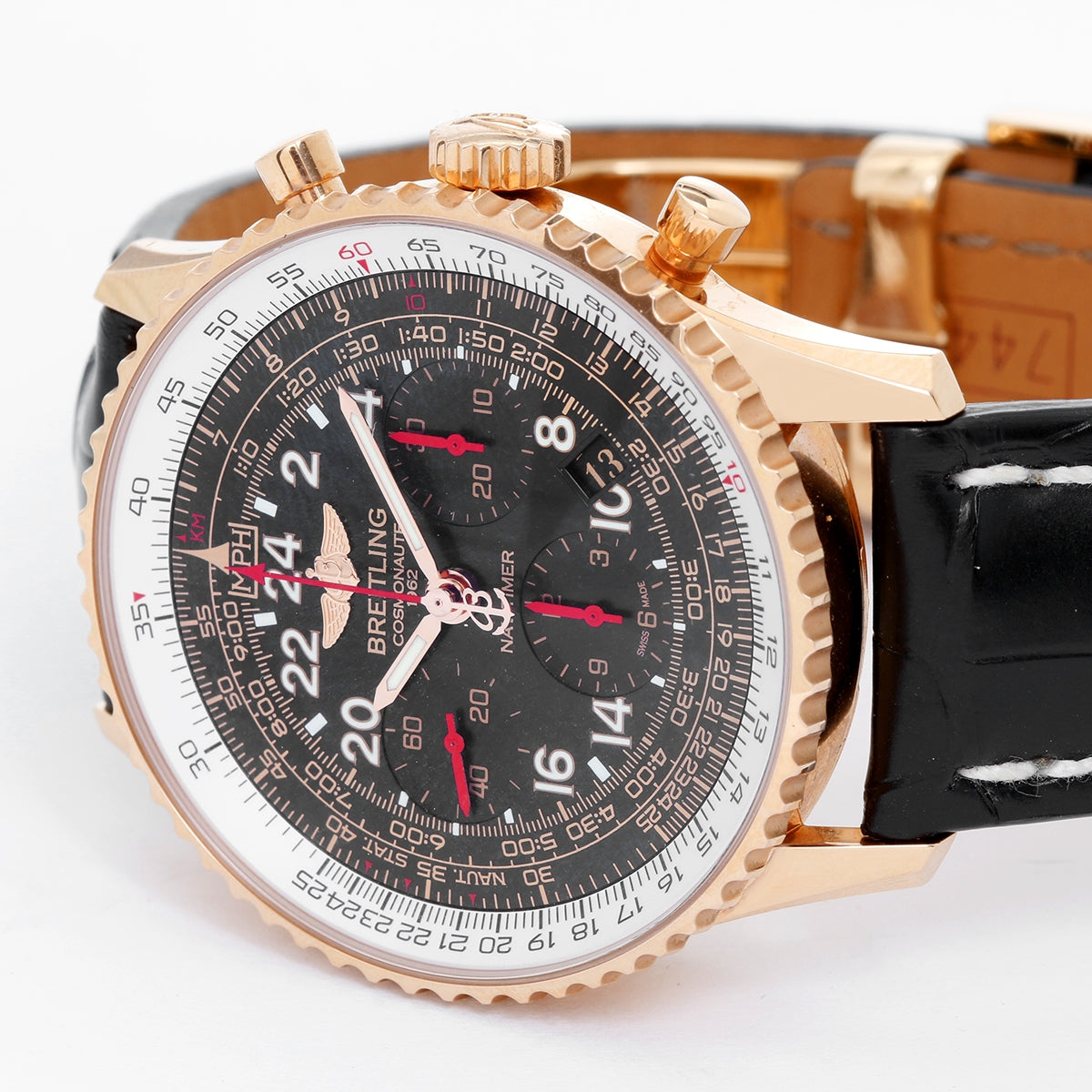 Breitling Navitimer Cosmonaute Rose Gold RB0210 - Manual. 18K Rose Gold ( 43 mm ). Black dial with Arabic numerals; sub dials with red hands. Black Breitling alligator strap. Pre-owned with Breitling box and papers. Limited edition 57 /250.