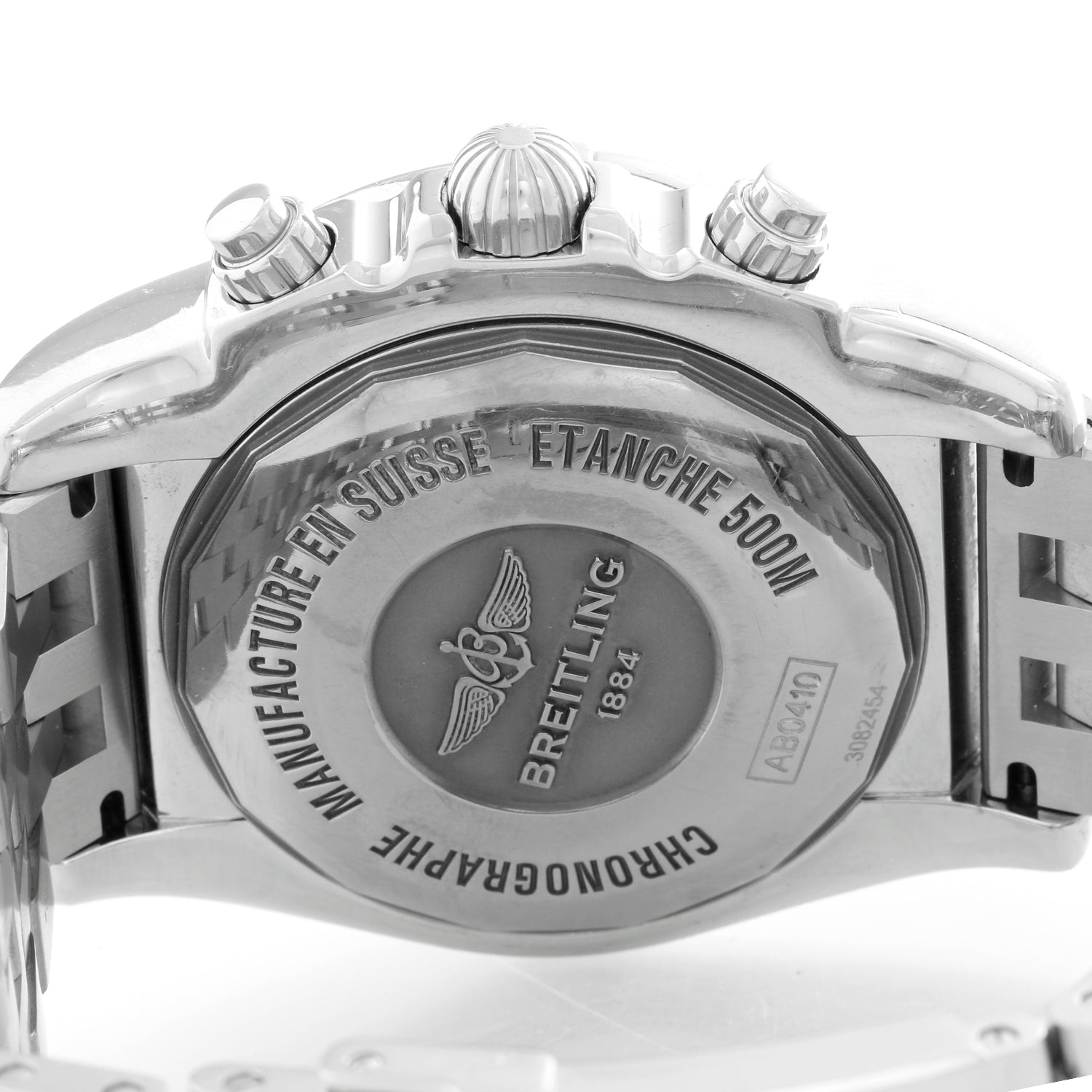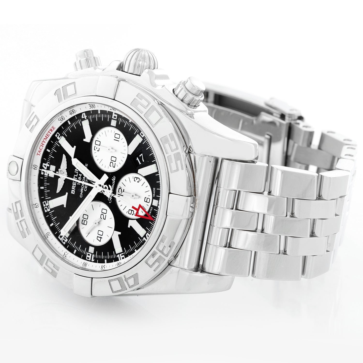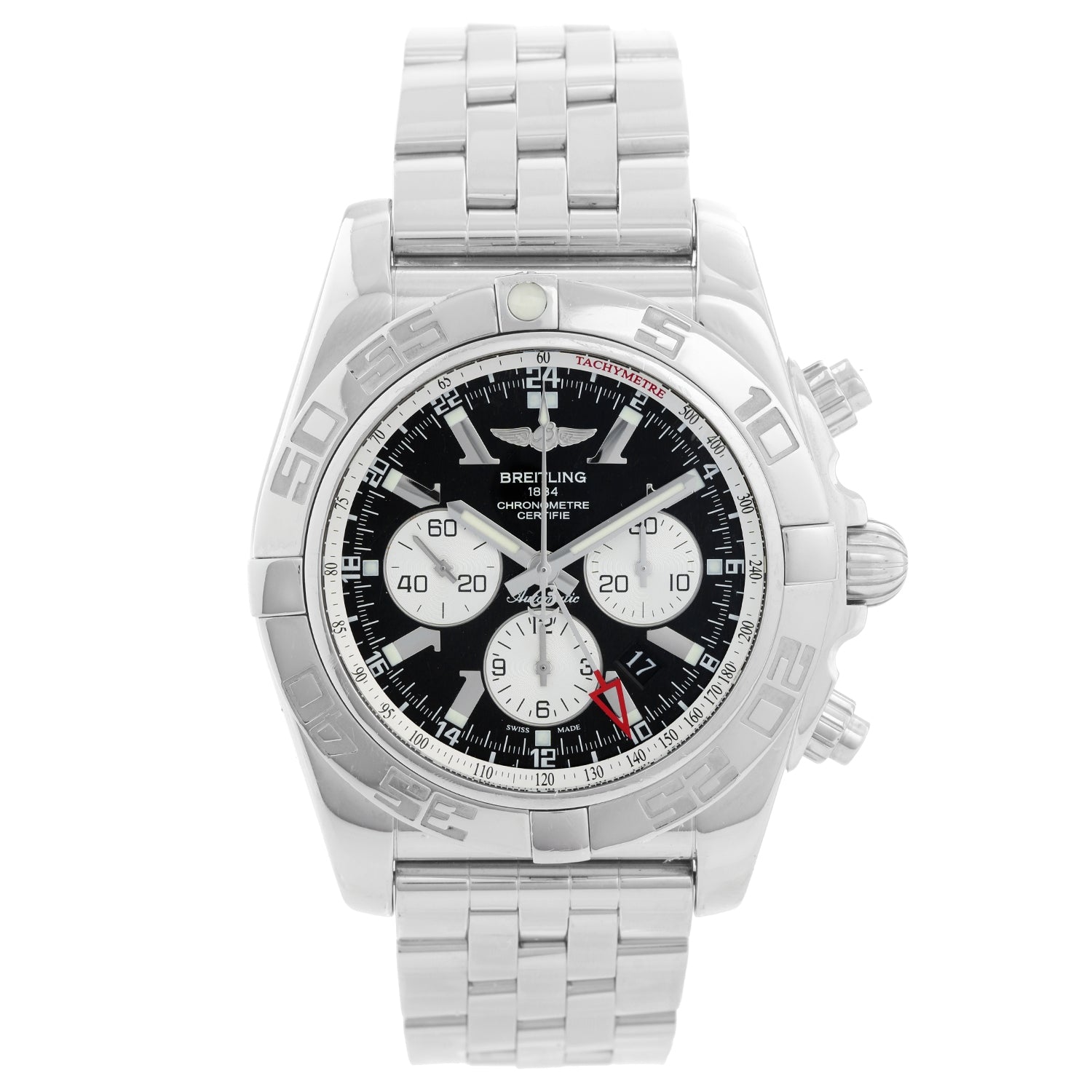 Breitling Windrider Chronomat GMT Men's Steel Watch AB0410 - Automatic winding. Stainless steel case with rotating bezel (47mm diameter). Black dial with silver sub-dials; hour, minute & seconds recorders; red arrow GMT hand. Stainless steel bracelet. Also comes with a Rubber strap with deployant clasp . Pre-owned with Breitling box and papers.