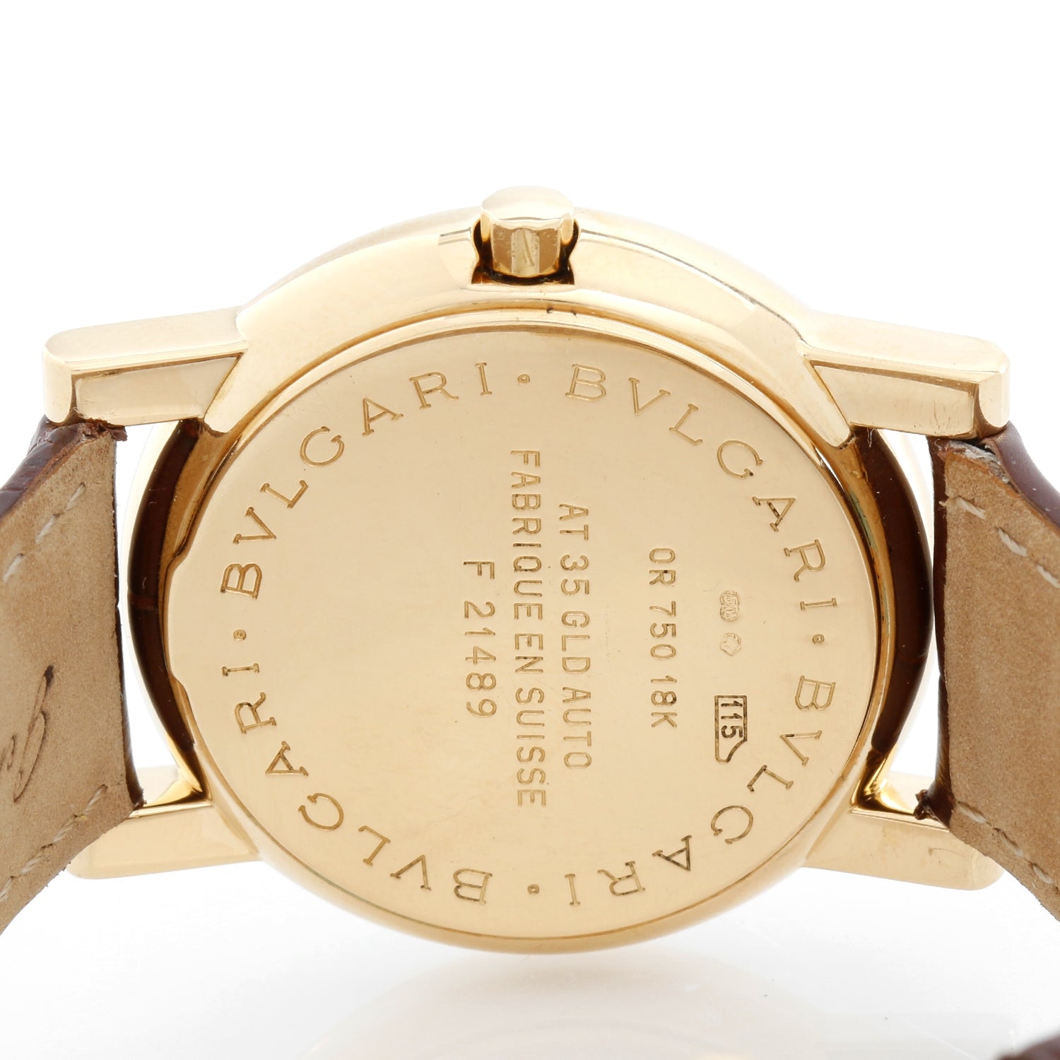 Bulgari Anfiteatro Automatic 18K Yellow Gold Watch AT35GLD - Automatic . 18K Yellow gold ( 35 mm ) . White dial with raised yellow gold stick hour markers with date at 3 o'clock . Brown leather strap with tang buckle . Pre-owned with Bulgari box and papers. Papers dated 2004.