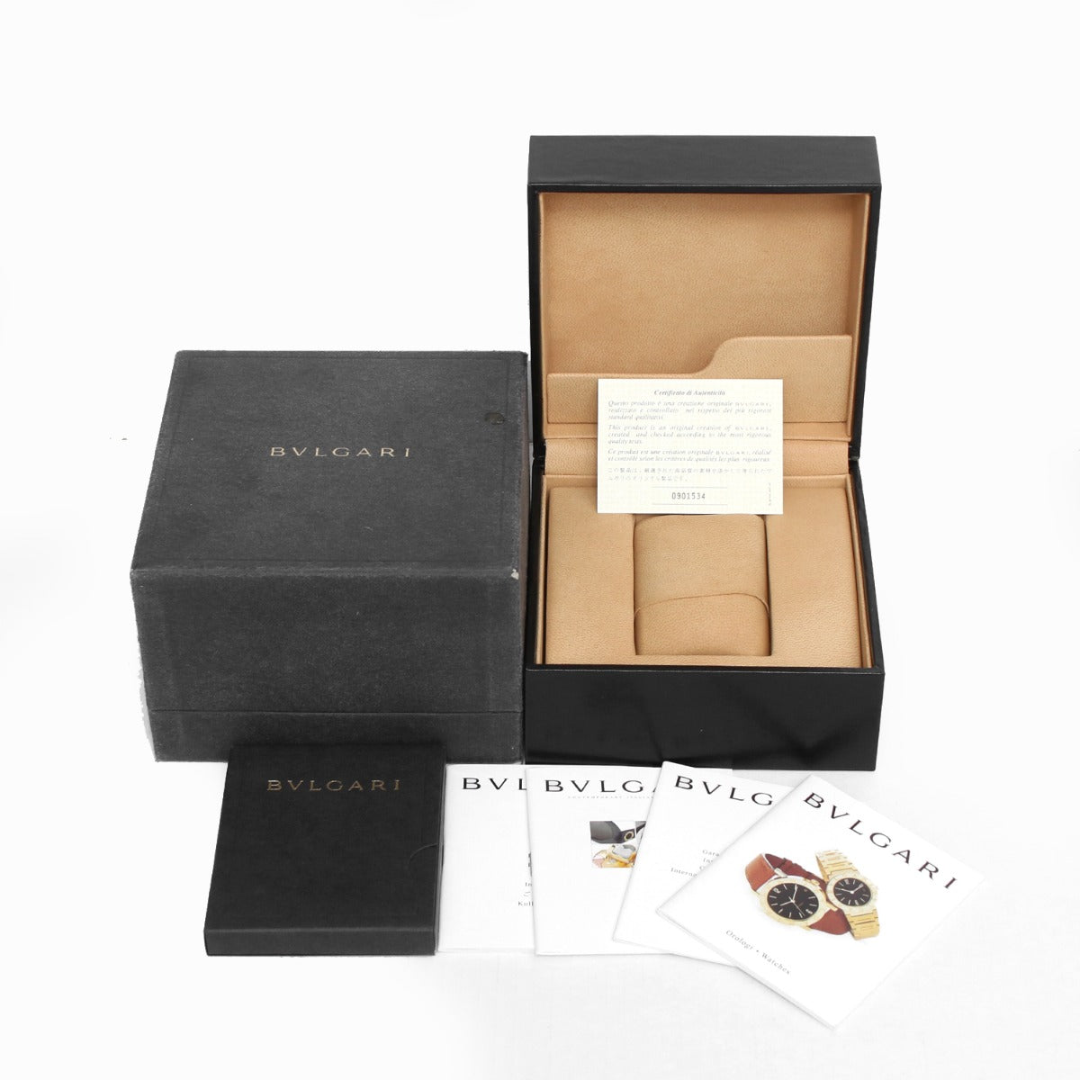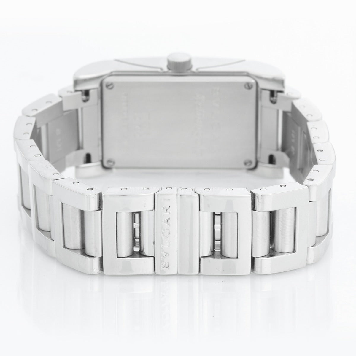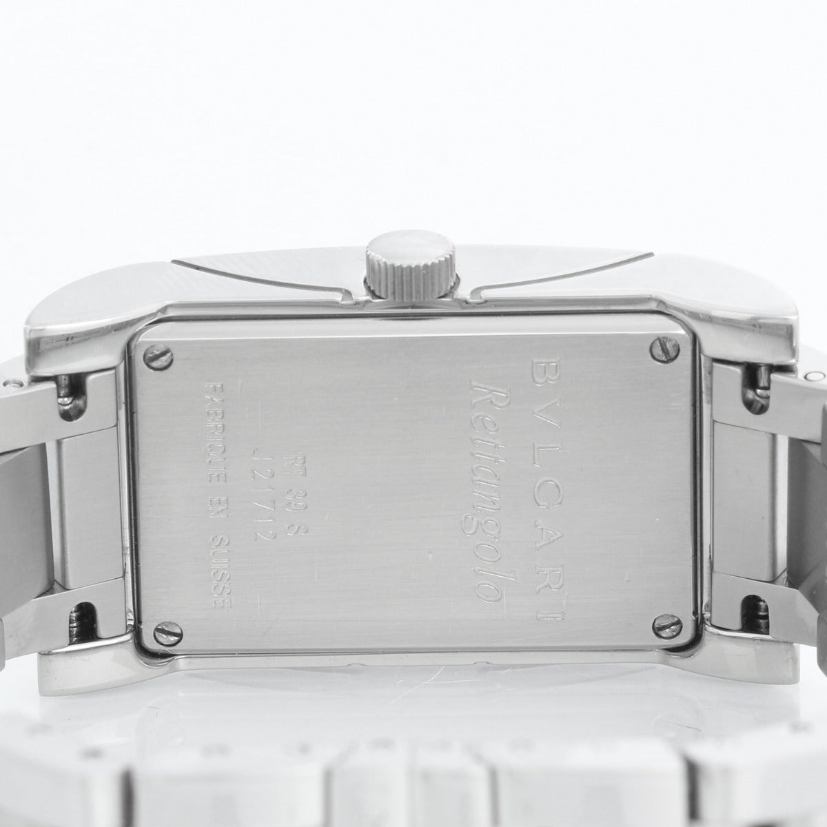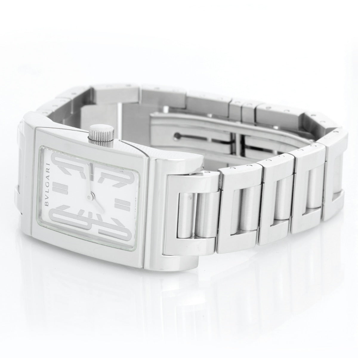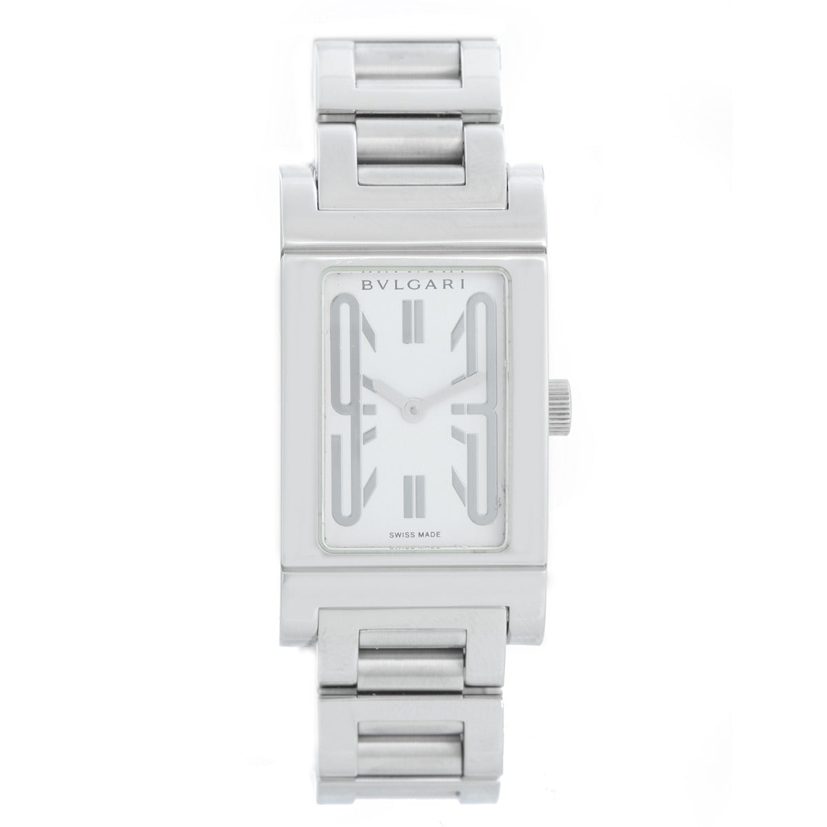 Bvlgari Rettangolo Ladies Steel Watch RT 39S - Quartz. Stainless steel case (21mm x 38mm). White dial with silver colored markers and large Arabic 3 & 9. Stainless steel Bvlgari bracelet with deployant clasp; this will fit a 6 1/4 inch wrist . Pre-owned with Bvlgari box and papers.