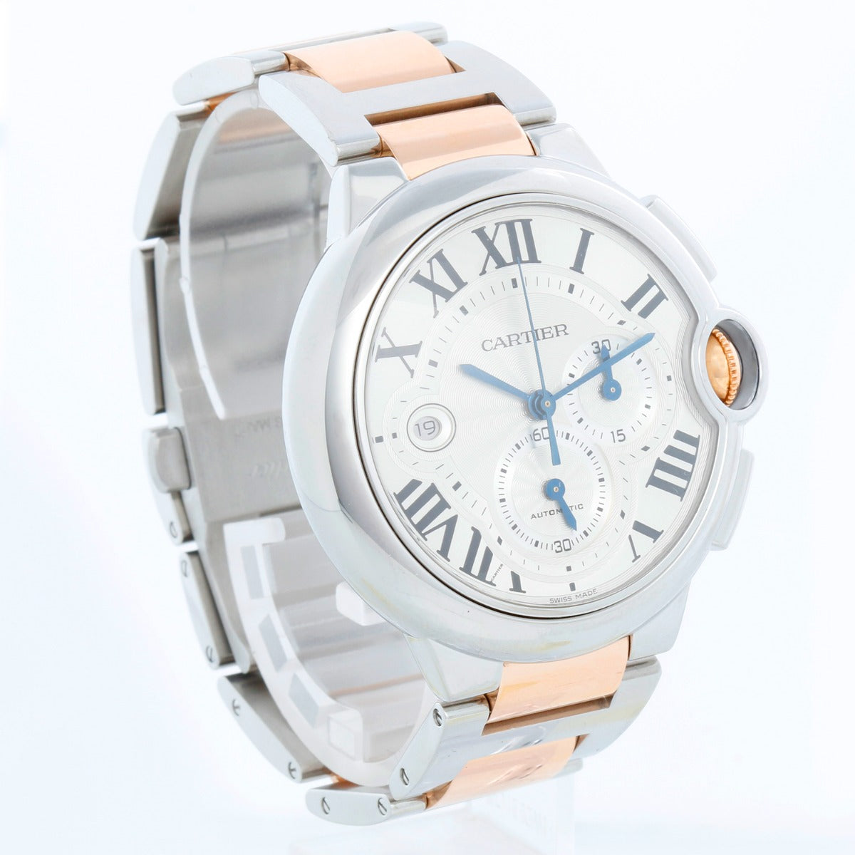 Cartier Ballon Bleu 44mm Stainless Steel & Rose Gold Chronograph W6920063 - Automatic winding; chronograph. Stainless steel  & Rose Gold (44mm diameter). Silver guilloche dial with black Roman numerals; date at 9 o'clock. Stainless steel & Rose Gold  Cartier bracelet. Pre-owned with custom box .