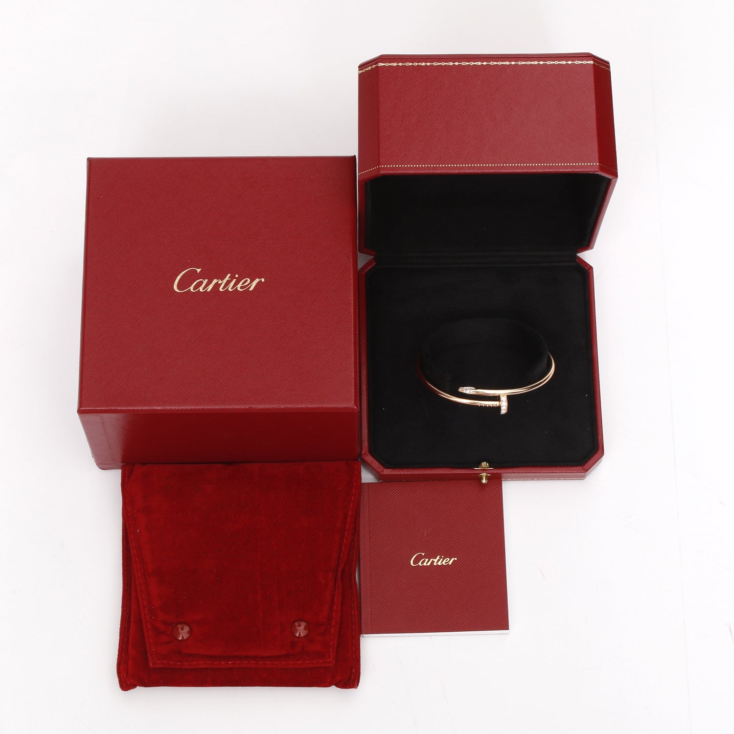 Cartier Juste un Clou 18k Pink Gold and Pave Diamond Bracelet Size 18 - This bracelet is a part of the Juste un Clou Collection and features pave diamonds set in 18k pink gold. Signed Cartier 18 BCI553 Au750. Size 18. Total weight is 31.0 grams. Cartier box and certificate included. Please note that the nail bracelet runs one size large. If you wear a size 19 on a Love bracelet then you would chose a size 18 on the nail bracelet.