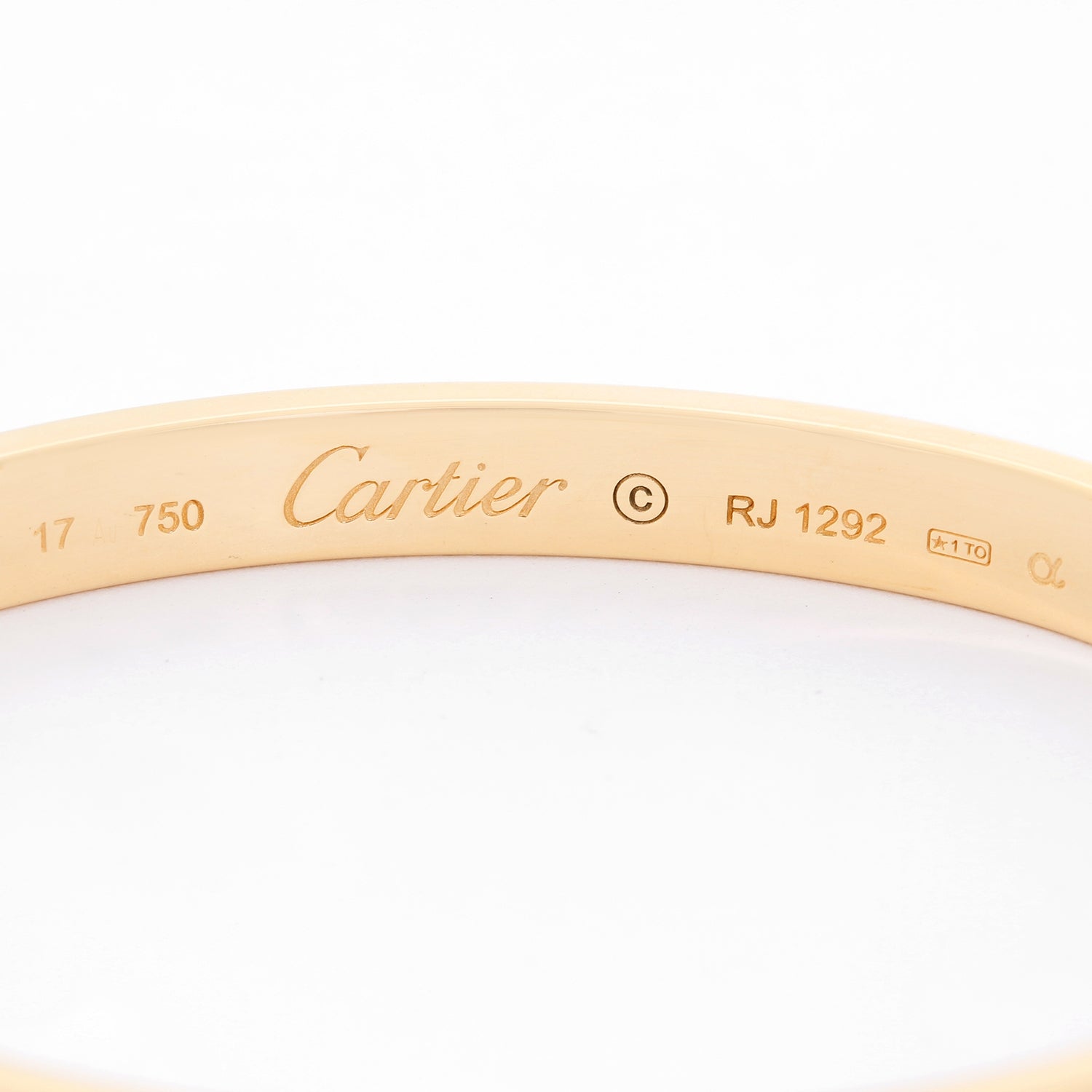Cartier Love Bracelet 18k Yellow Gold Size 17 with Screwdriver - This beautiful bracelet is stamped Cartier, 17, 750 and RJ1292. This is a great piece for everyday as well as dress. Authenticity guaranteed. Includes screwdriver and Cartier box and papers. .