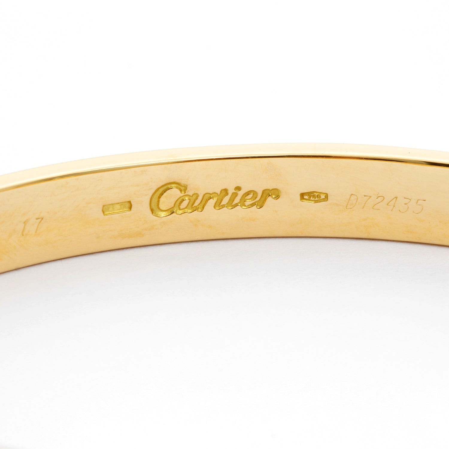 Cartier Love Bracelet 18k Yellow Gold Size 17 with Screwdriver - This beautiful bracelet is stamped Cartier, 17, 750 and D72435. This is a great piece for everyday as well as dress. Authenticity guaranteed. Includes screwdriver and Cartier papers and Cartier box.