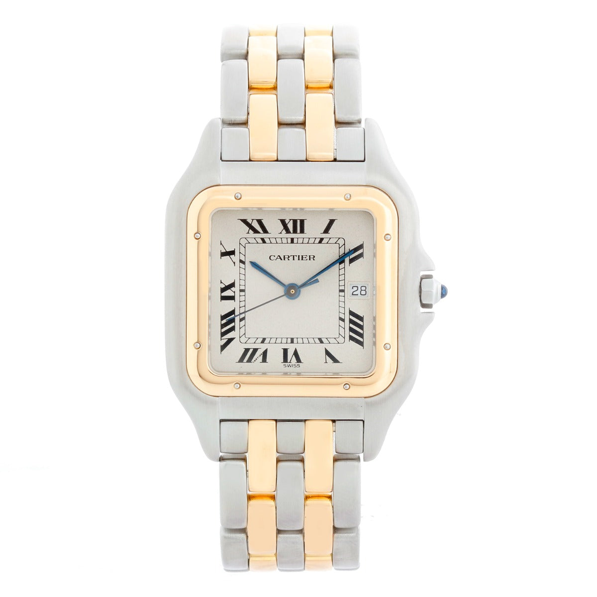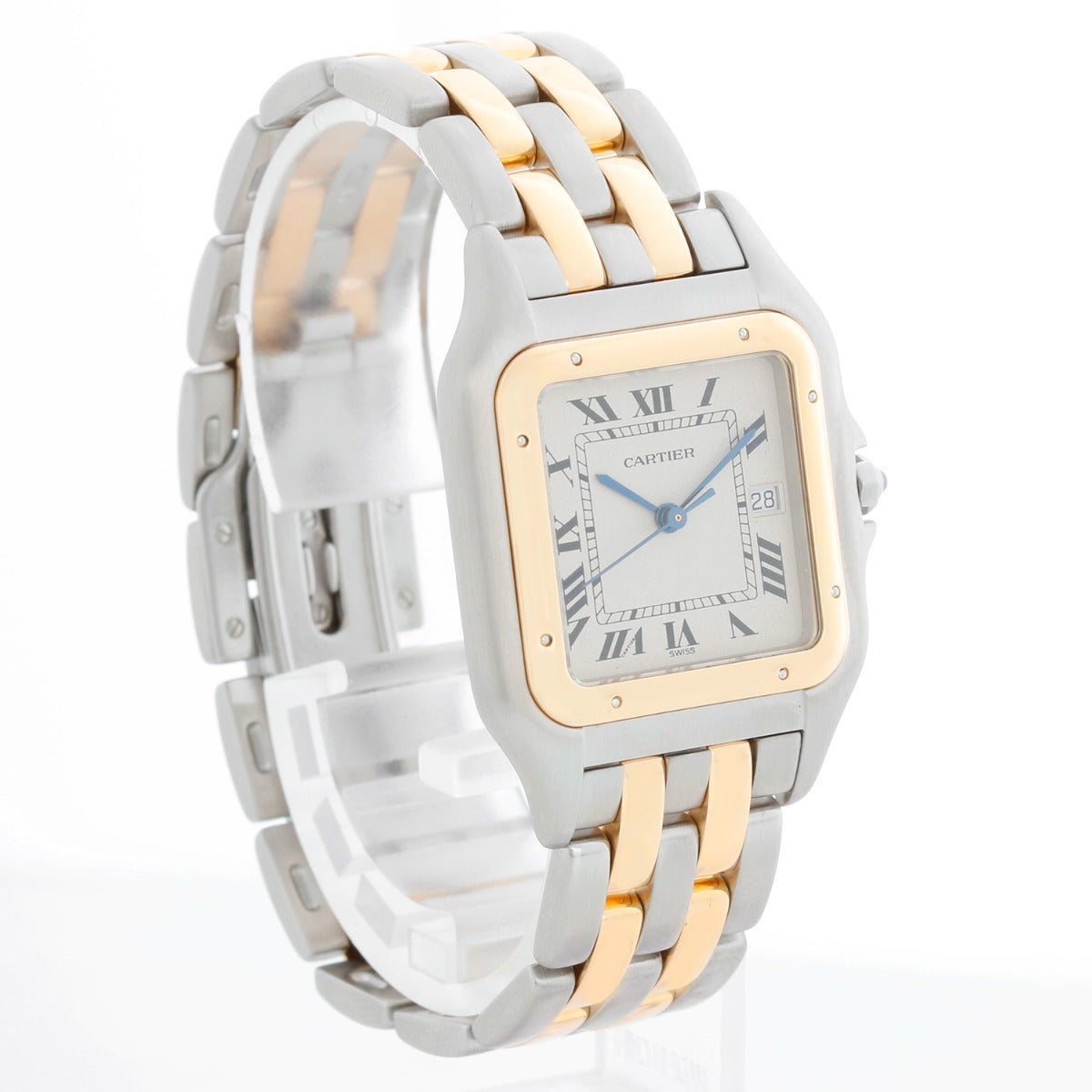 Cartier Men's 2-Tone Steel Gold Jumbo Panther Watch 187957 - Quartz. Stainless steel case with 18k yellow gold bezel (29mm x 40mm). Ivory colored dial with black Roman numerals; date at 3 o'clock position. 2-Row Stainless steel & 18k yellow gold Cartier Panther bracelet with deployant clasp; will fit up to a 6.5 inch wrist . Pre-owned with Cartier Pouch.