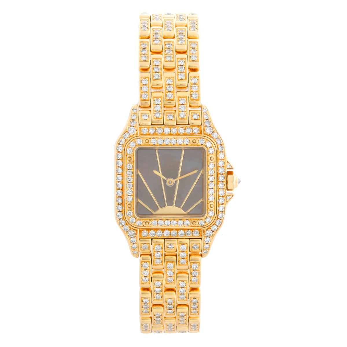 Cartier Panther Ladies 18k Yellow Gold Pave Diamond & Tahitian Mother of Pearl Watch WF3072FF 1280 - Quartz. 18k yellow gold case with factory pave diamond bezel and pave diamond case (22mm x 30mm ). Genuine Cartier Tahitian Mother of Pearl Sunset dial. Cartier 18K Yellow Gold factory link diamonds bracelet; will fit a 6 1/2 inch wrist. Pre-owned with Cartier box, book and open papers.