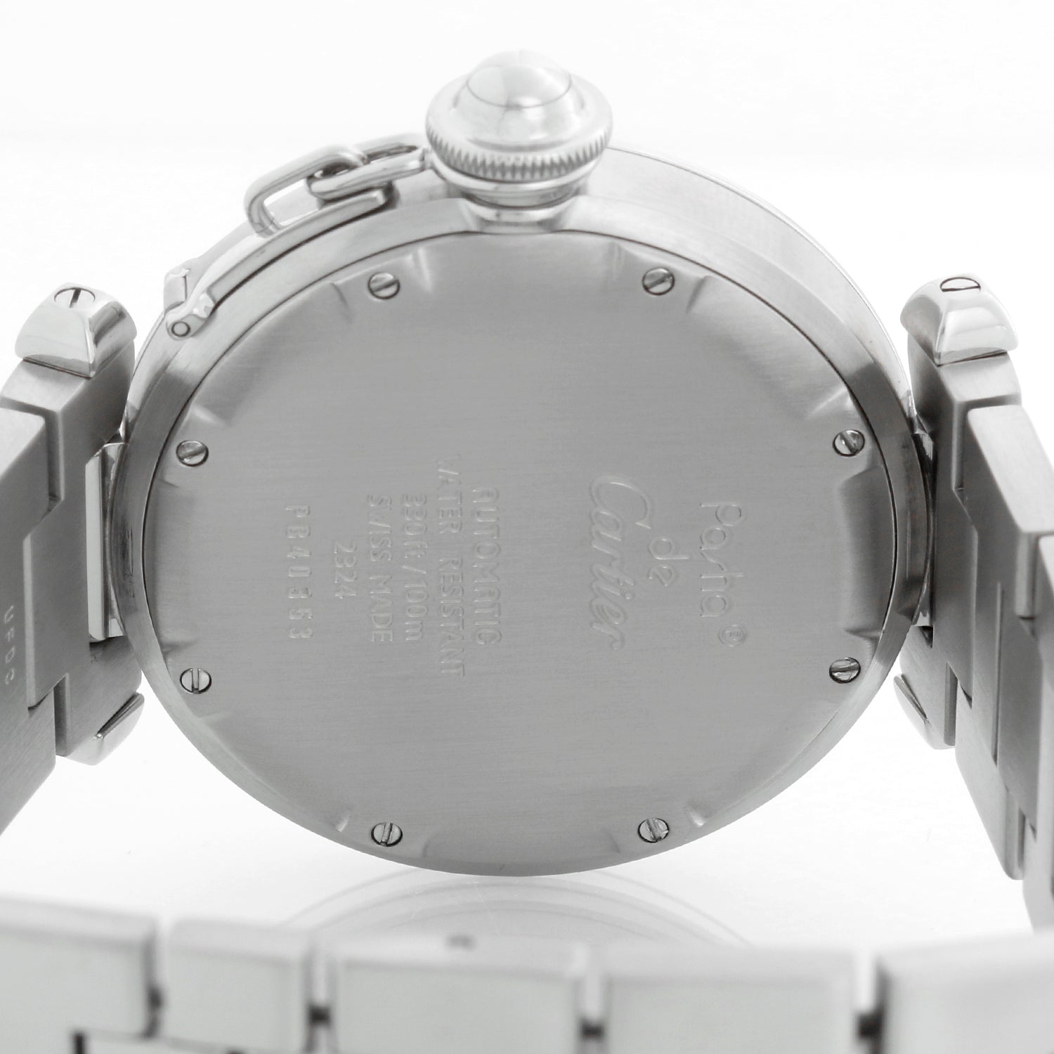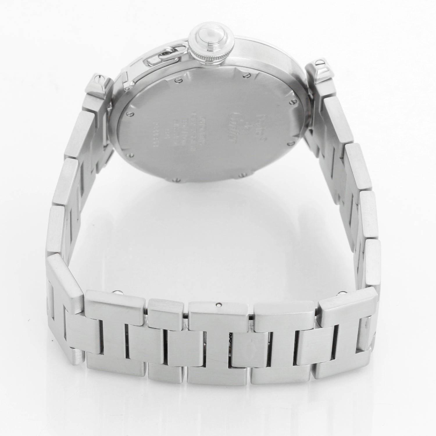 Cartier Pasha C Midsize Stainless Steel Men's or Ladies Watch 2324 W31015M7 - Automatic winding. Pasha Midsize. Stainless steel case with smooth bezel (35 mm). White dial with black Roman numerals and gold stick markers; date between 4 & 5 o'clock. Stainless steel Cartier bracelet with deployant clasp; will fit up to a 7 inch wrist. Pre-owned with custom box, book and open papers.