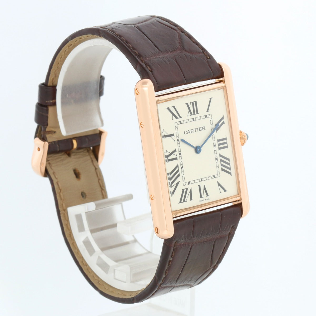 Cartier Tank Louis XL Rose Gold Manual Winding Men's Watch W1560017 - Manual winding. 18k rose gold case ( 32 x 40 mm). Silver dial with black roman numerals. New Brown Cartier strap with 18K Cartier buckle. Pre-owned with Cartier box.