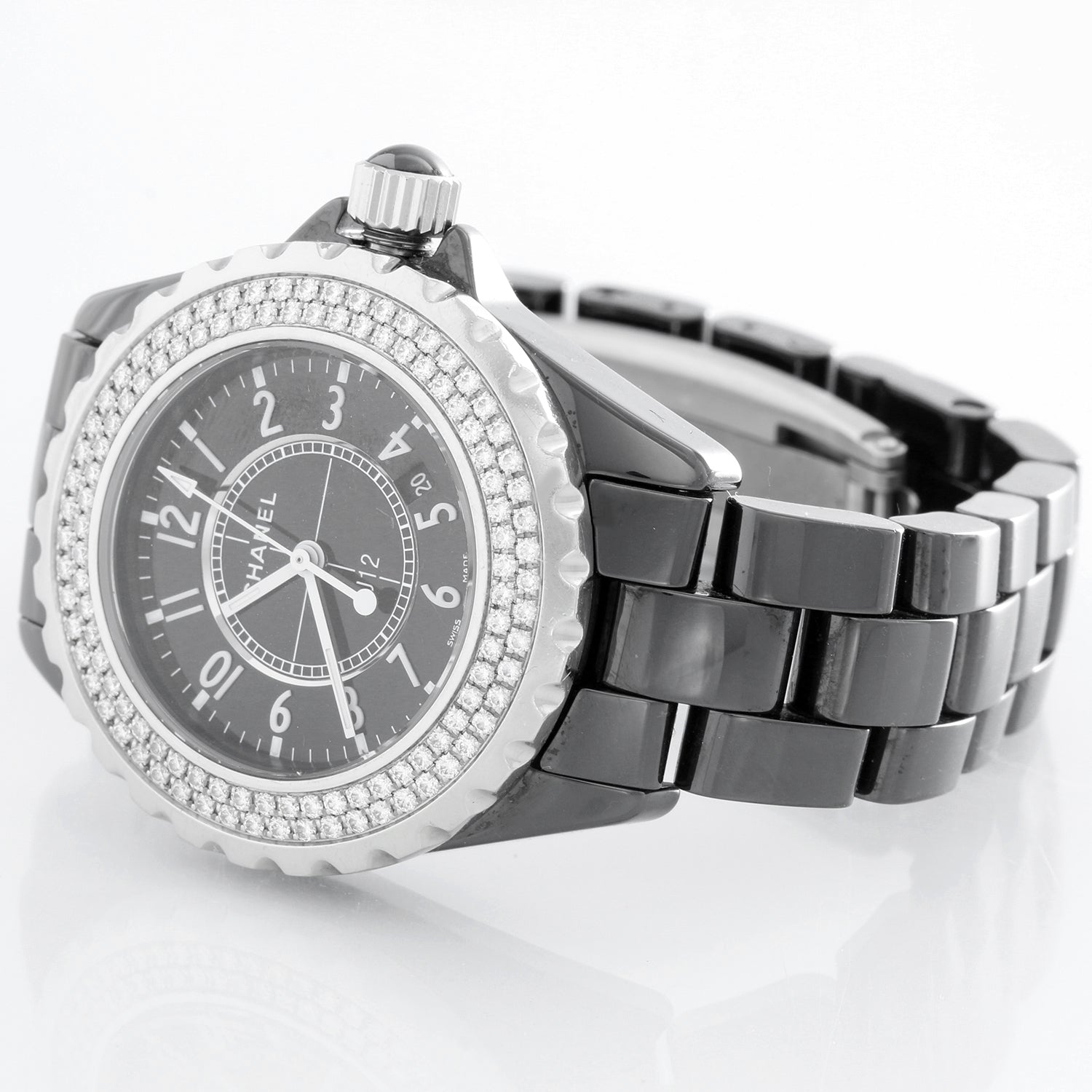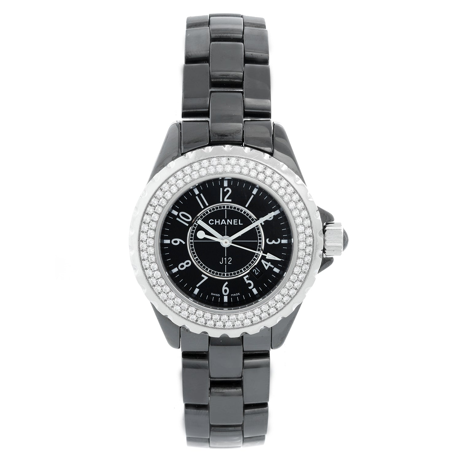 Chanel J12 Black Ceramic 33MM Diamond Watch H0949 - Quartz. White ceramic case with 2-row diamond bezel (33mm diameter). Black dial with black Arabic numerals; date between 4 & 5 o'clock. Black ceramic bracelet. Pre-owned with custom box.