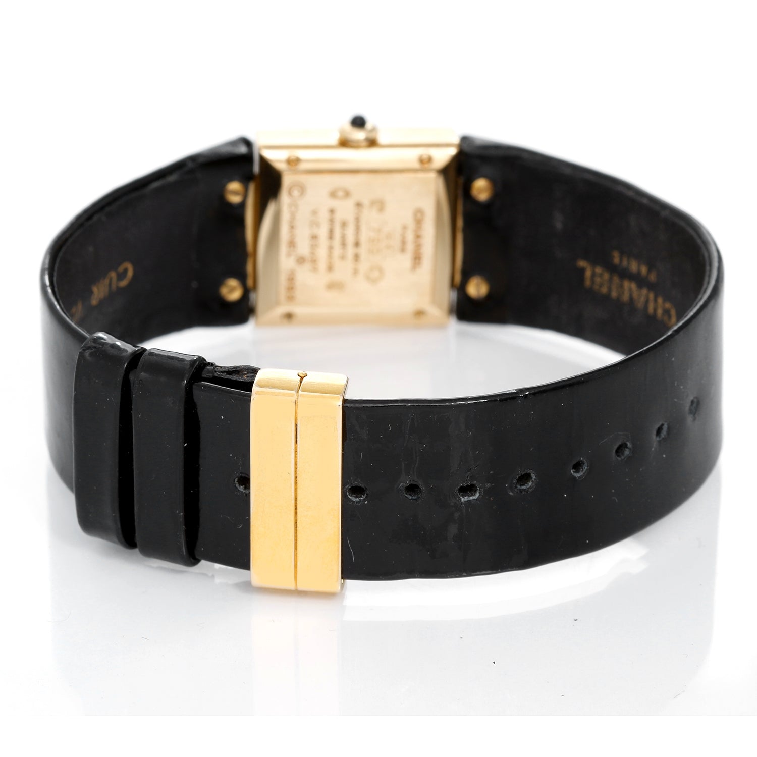 Chanel Matelasse 18 K Yellow Gold Ladies Watch - Quartz. 18K Yellow Gold ( 19 mm x 19 mm ). Textured back dial with gold hands. Black leather strap with 18K yellow gold deployant buckle. Pre-owned with box.