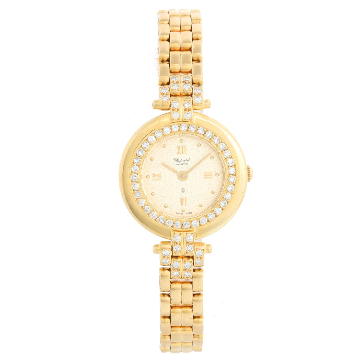 Chopard 18k Yellow Gold Diamond Ladies Watch 887/1 - Quartz. 18k yellow gold case with diamond bezel with diamond lugs; set with 60 diamonds (23mm diameter). Special stone dial. 18K Yellow gold bracelet, measuring 6 1/4 inch wrist. Pre-owned with Chopard pouch.