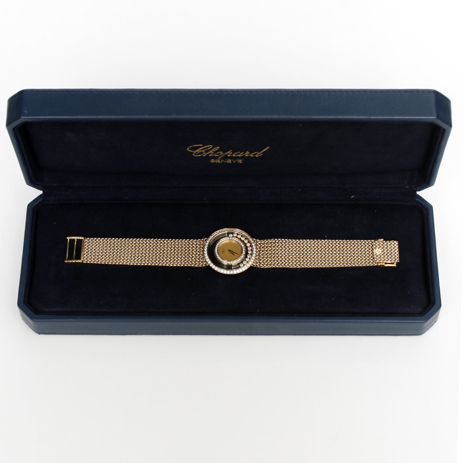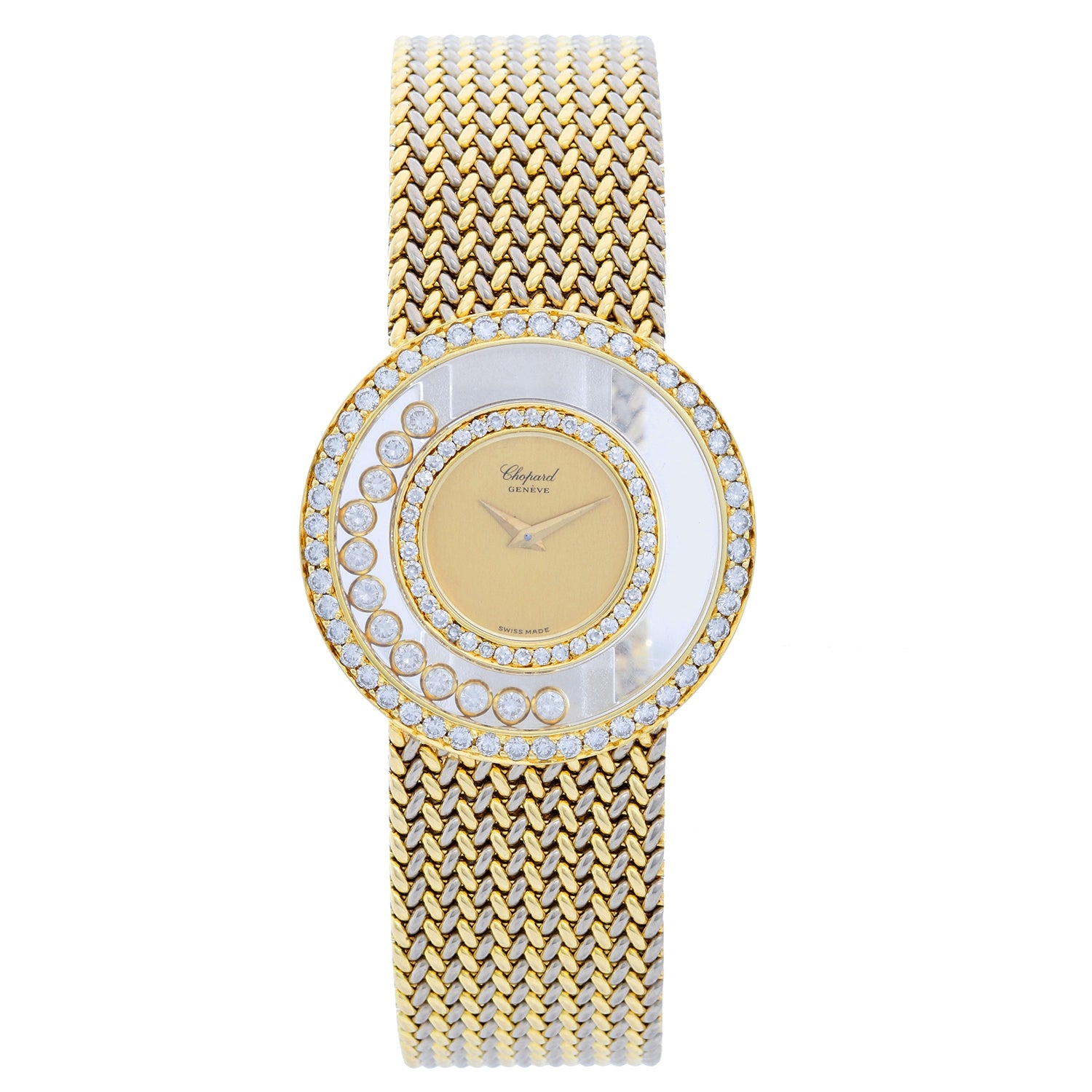 Chopard Happy Diamonds 18K Gold Ladies Watch - Quartz. 18K yellow gold case with pave-set diamond bezel; two glazed plated containing 12 free floating diamond collets ( 32 mm ). Champagne dial. Mesh 18K yellow gold bracelet. Pre-owned with Chopard box. Will fit up to a 7 1/2 wrist.