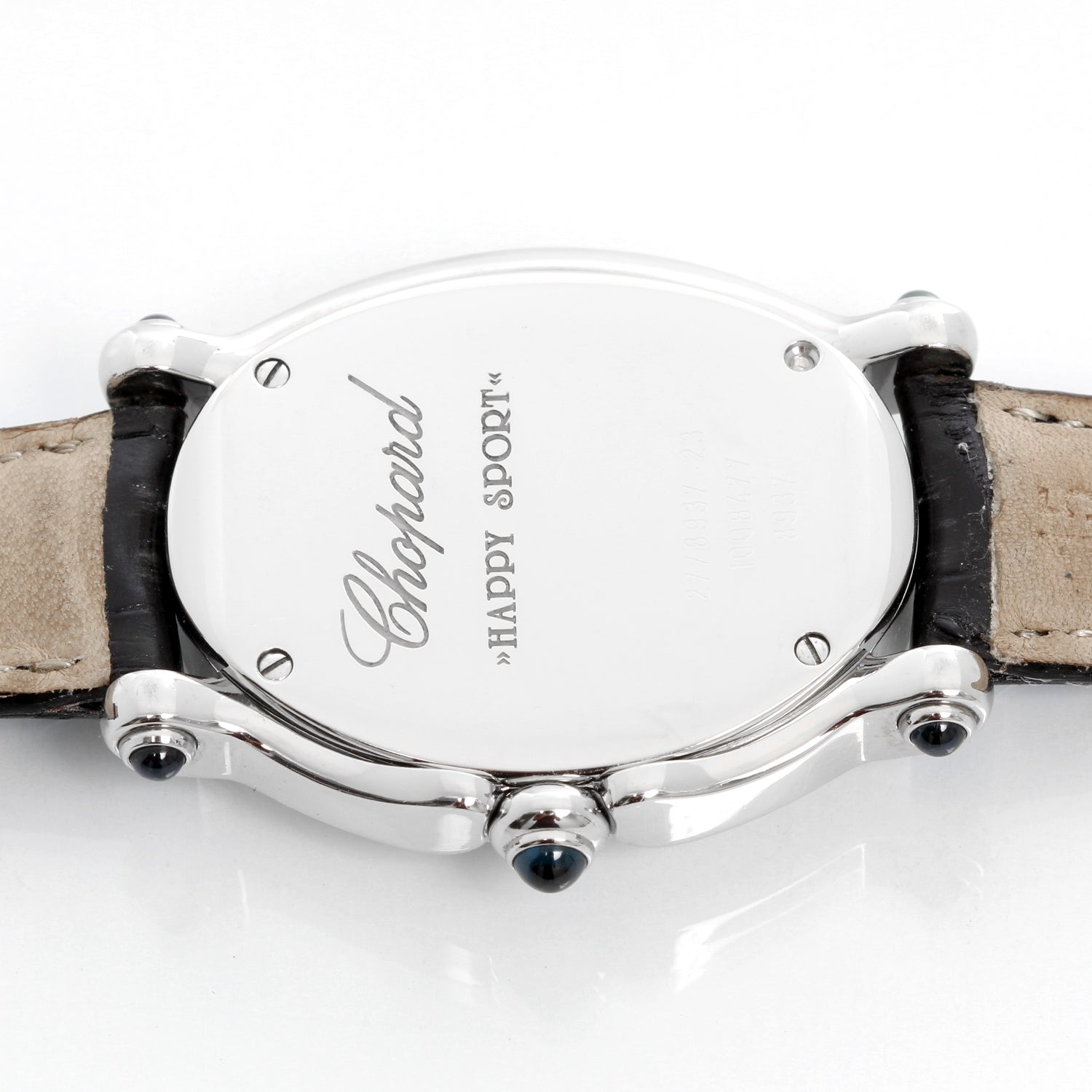 Chopard Happy Sport Oval Stainless Steel Watch - Quartz. Stainless steel oval shaped case ( 30x 40 mm ). White matter dial with seven " floating " full cut diamonds; date at 6 o'clock. Black alligator strap band with Chopard stainless steel buckle. Pre-owned with Chopard Box Circa 2000's.