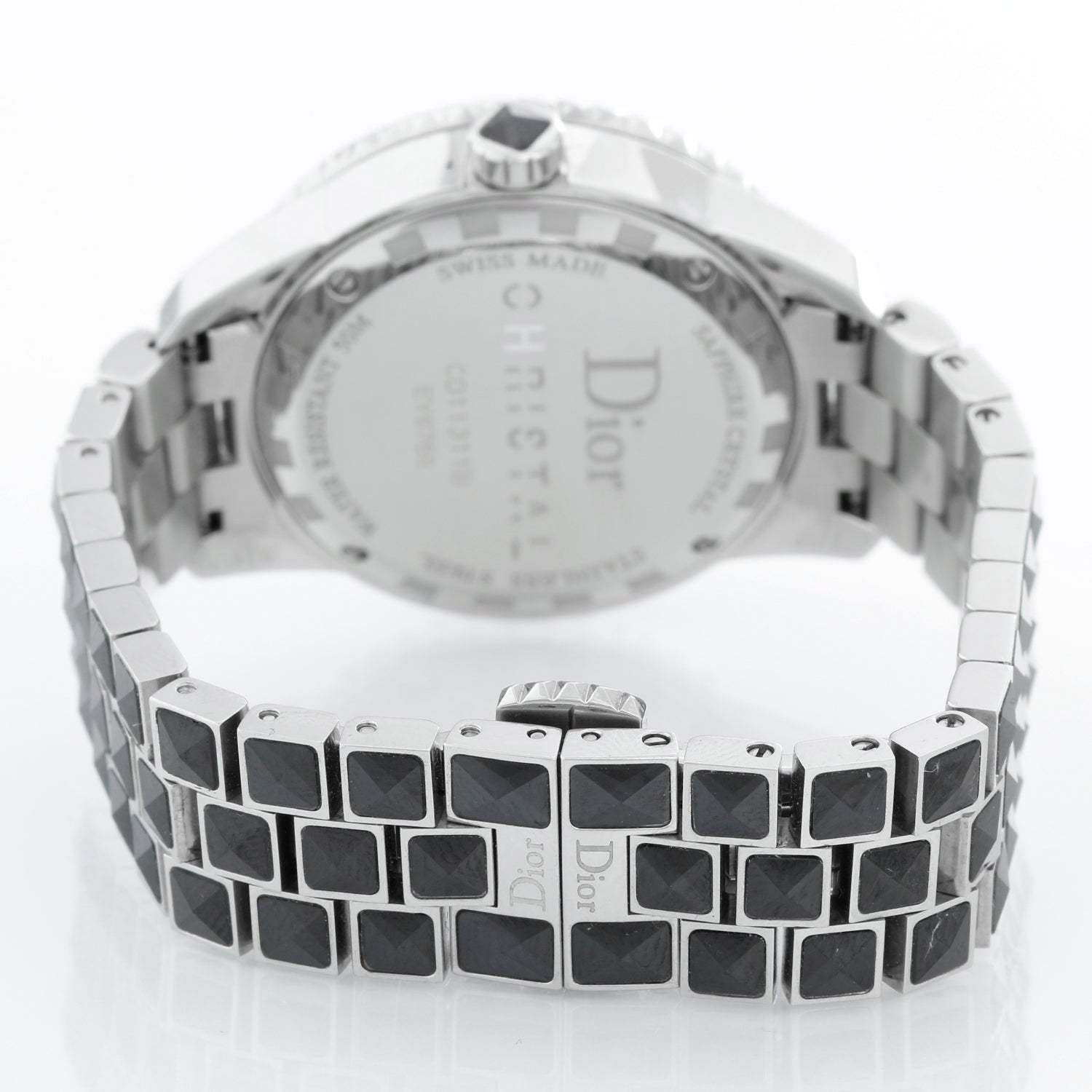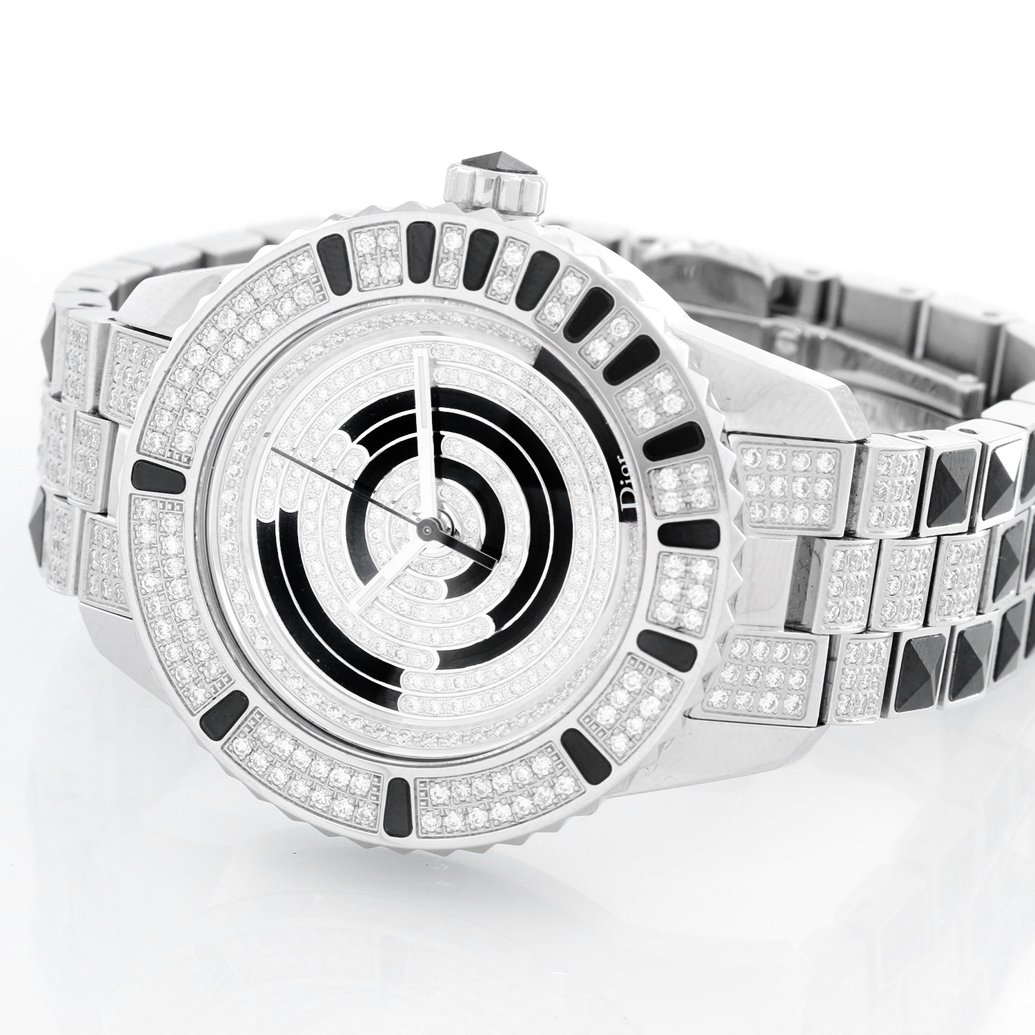 Christian Dior Christal Diamond Ladies Watch - Quartz. Stainless steel case (33 mm) with pave diamonds and gemstones. Diamond and black gemstones dial. Pave diamond bracelet with double deployant clasp; will fit a 6 1/4 inch wrist. Pre-owned with custom box.