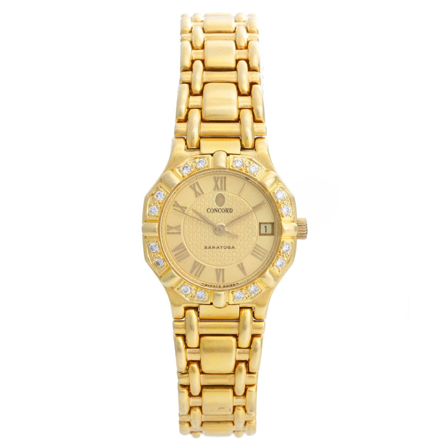 Concord Ladies 18K Yellow Gold Saratoga Ladies Watch - Quartz. 18K Yellow gold with diamond bezel ( 24 mm ). Textured Champagne dial with Roman numerals. 18K Yellow gold link bracelet with deployant clasp. Pre-owned with custom box. Will fit a 6 1/4 inch wrist.