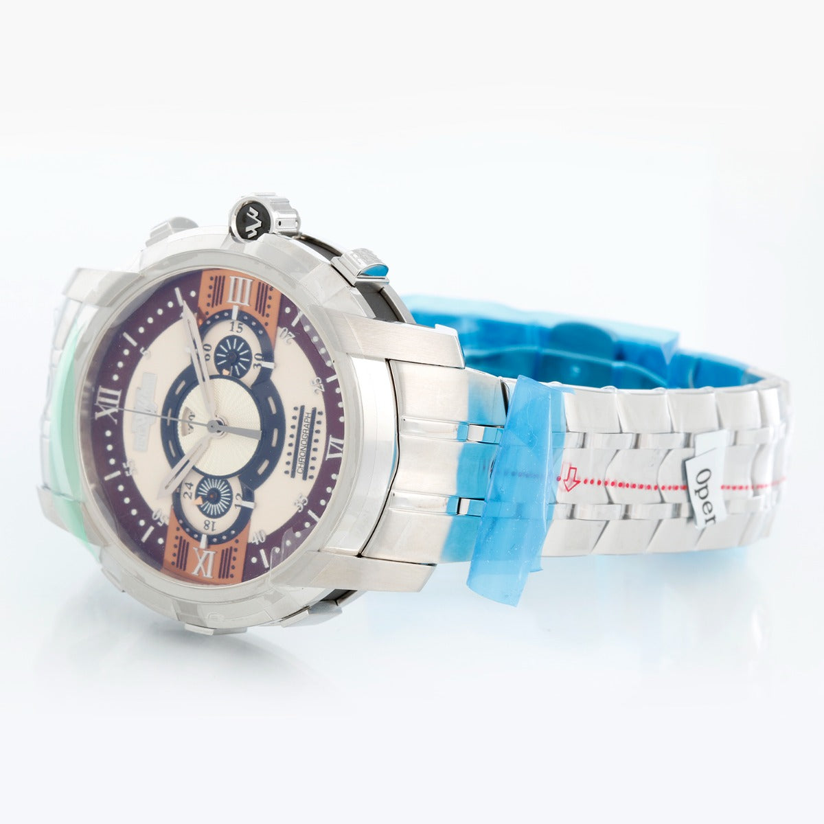 DeWitt Academia Glorious Knight Chronograph Men's Watch FTV.CHR.010S5 - Automatic winding, Chronograph, 42-hour power reserve. Stainless Steel with fixed silver-tone stainless steel bezel (46 mm ). White dial with silver-tone hands and Roman and Arabic numeral hour markers. Minute markers around the outer rim. Stainless steel silver tone bracelet. Unused with Dewitt box and Card