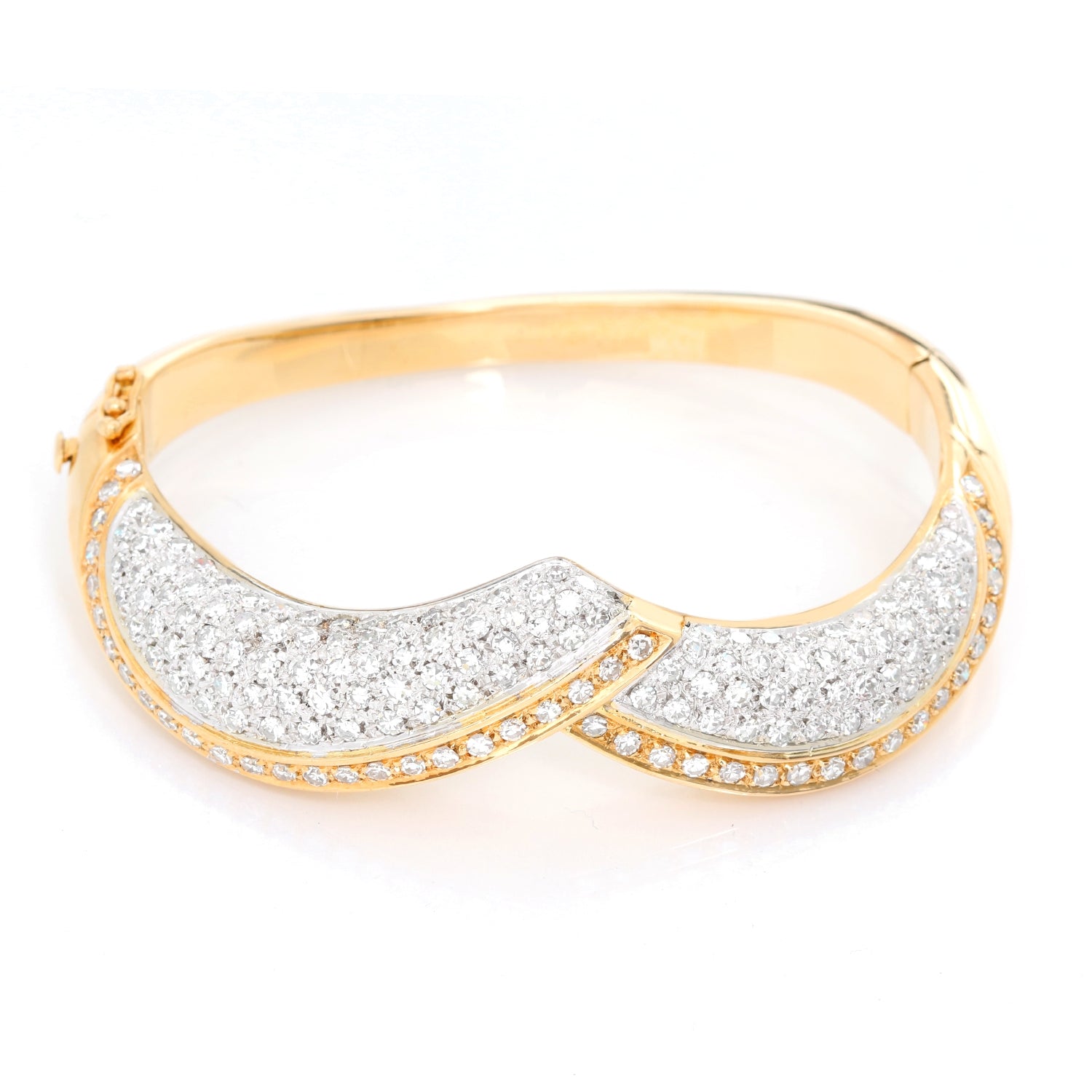 Diamond and Yellow Gold Bangle - . Beautiful Yellow Gold Bangle with Round brilliant cut diamonds. Estimated total diamond weight 5. cts. Diameter 2 1/8 inch. Total weight 47 grams.