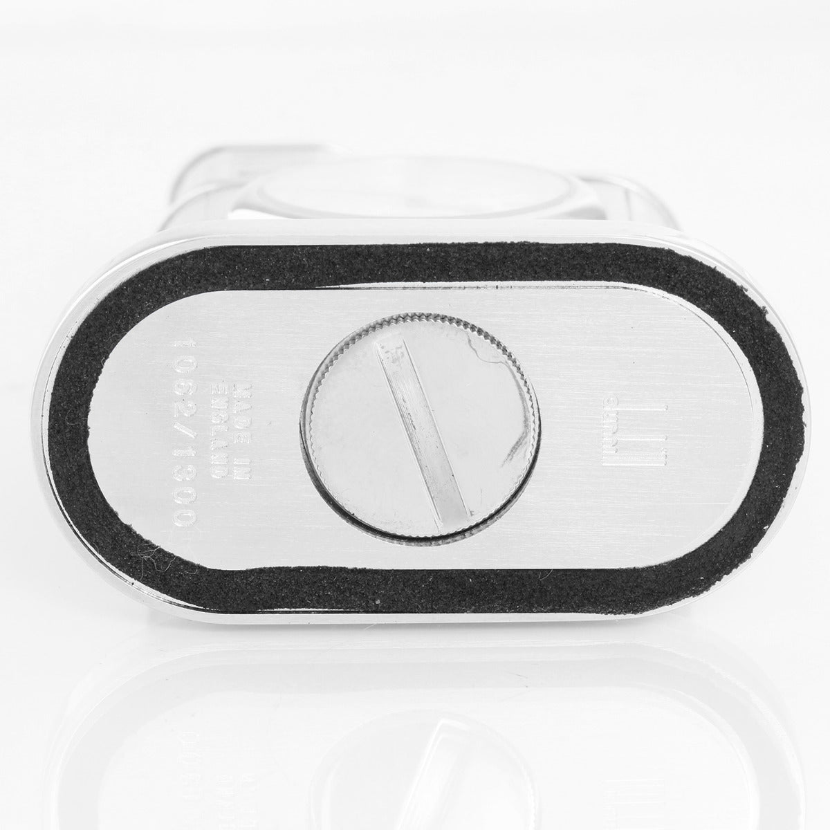 Dunhill Longitude Clock/ Lighter - Quartz. Silver plated. White dial with Roman numerals. New old stock with Dunhill box, papers and book. Limited edition of 1300. 1062/1300. Made in England. Dimensions H: 68mm x W: 59mm x D: 30mm.