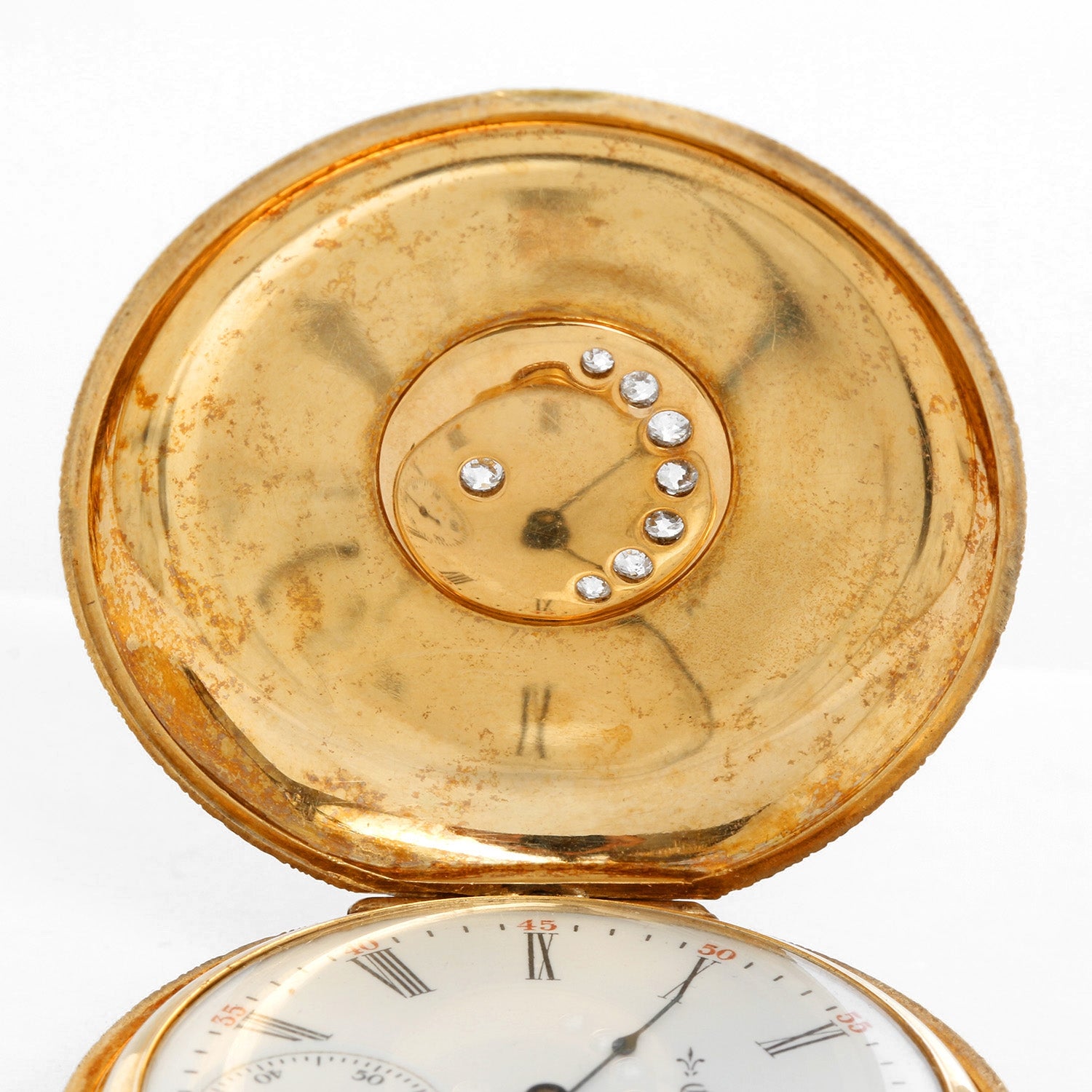 Elgin 18K Yellow Gold Hunting Case Pocket Watch - Manual winding. 18K Yellow gold case with star engraving on both front and back. Diamond set moon and star on front side (41m mm) . White dial with Roman numerals. Pre-owned with custom box.