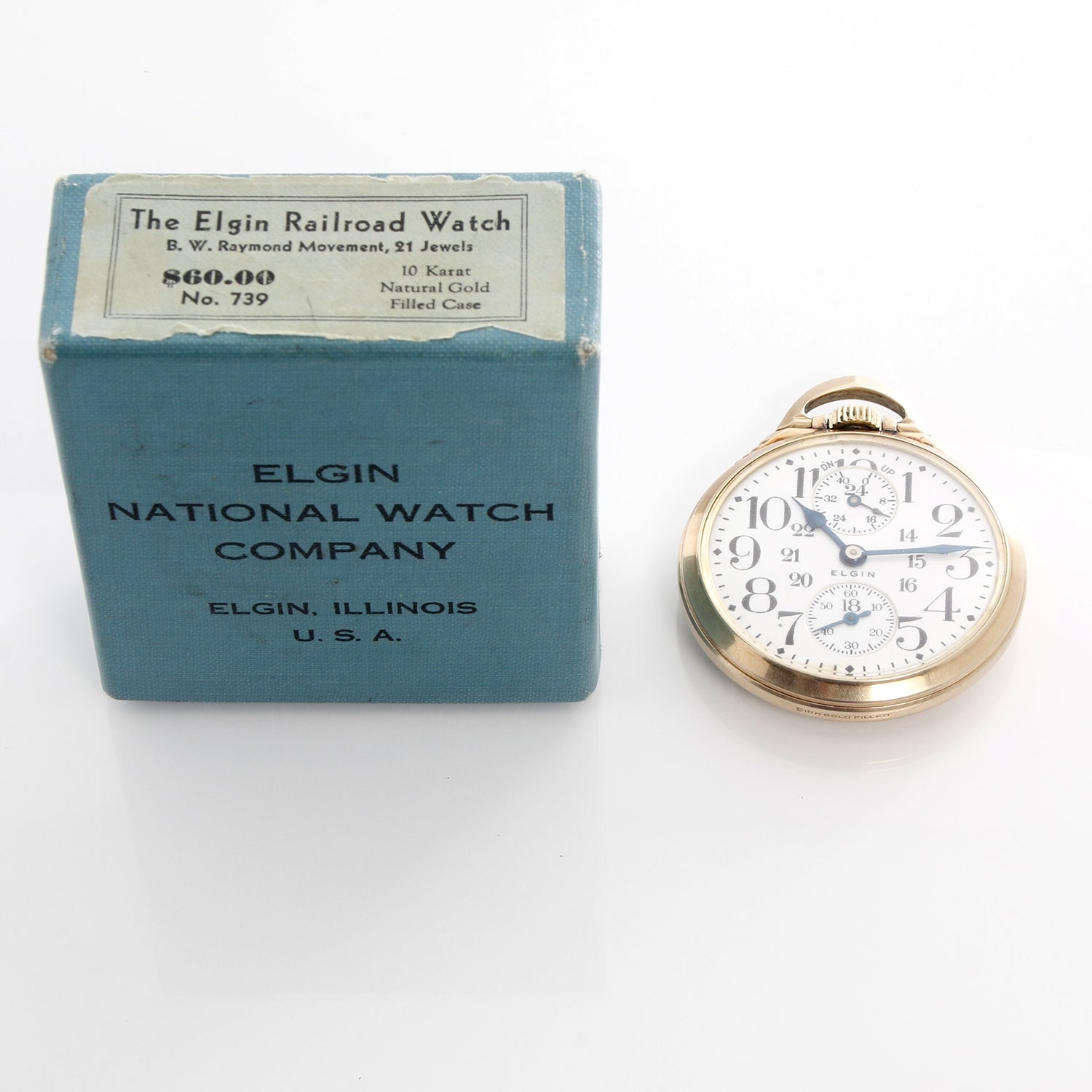 Elgin 23J BW Raymond Pocket Watch - Manual winding; 23 Jewel. 10K Gold filled ( 50 mm). Up and down indicator with 24 hour dial; White with Arabic numerals and sunken subdials . Very hard to find in this condition. Circa 1934. Pre-owned with original box. Grade 494. Total produced 5000.