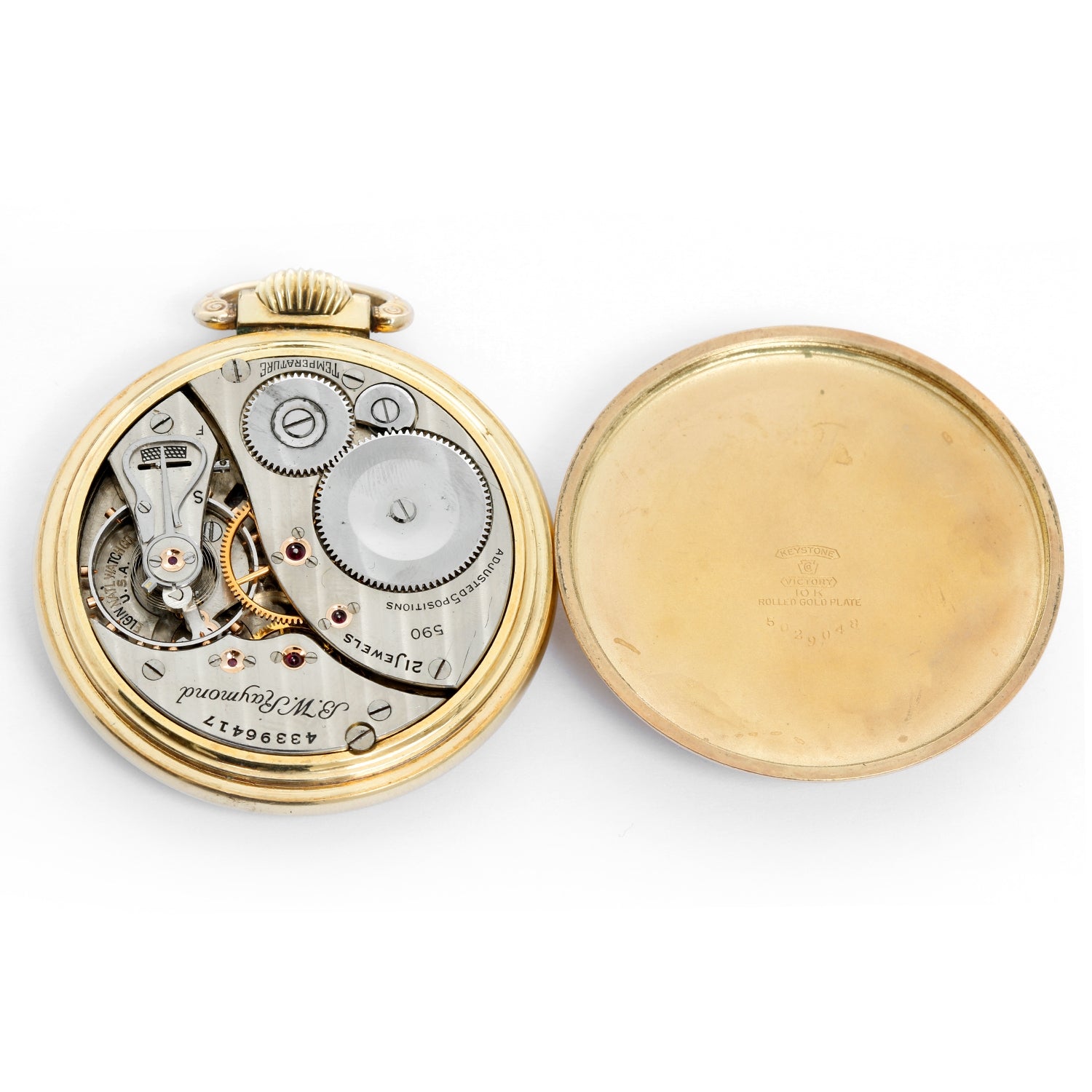 Elgin Pocket Watch - Manual winding; 21 jewels. Gold filled . White enamel single sunk dial with Arabic numerals . Pre-owned with custom box. Railroad approved..