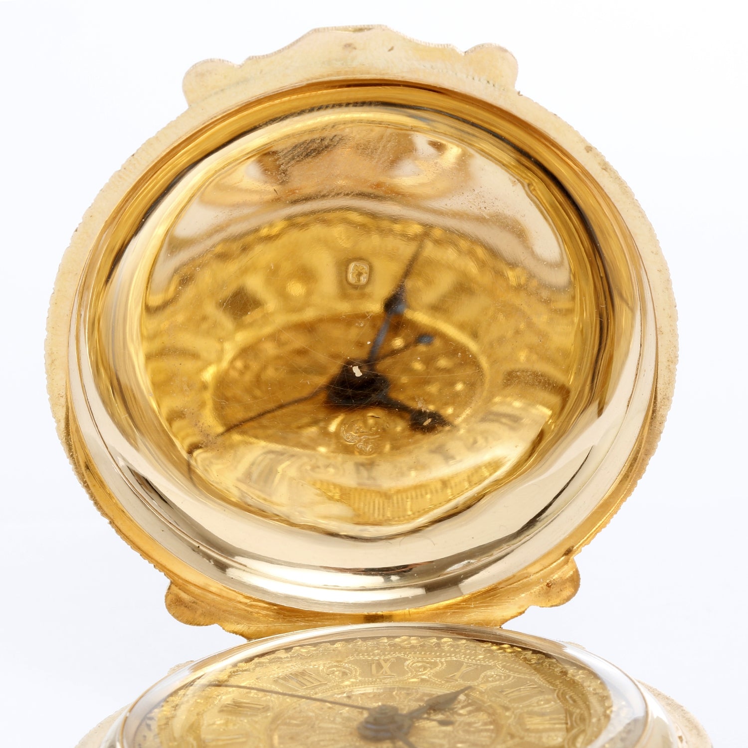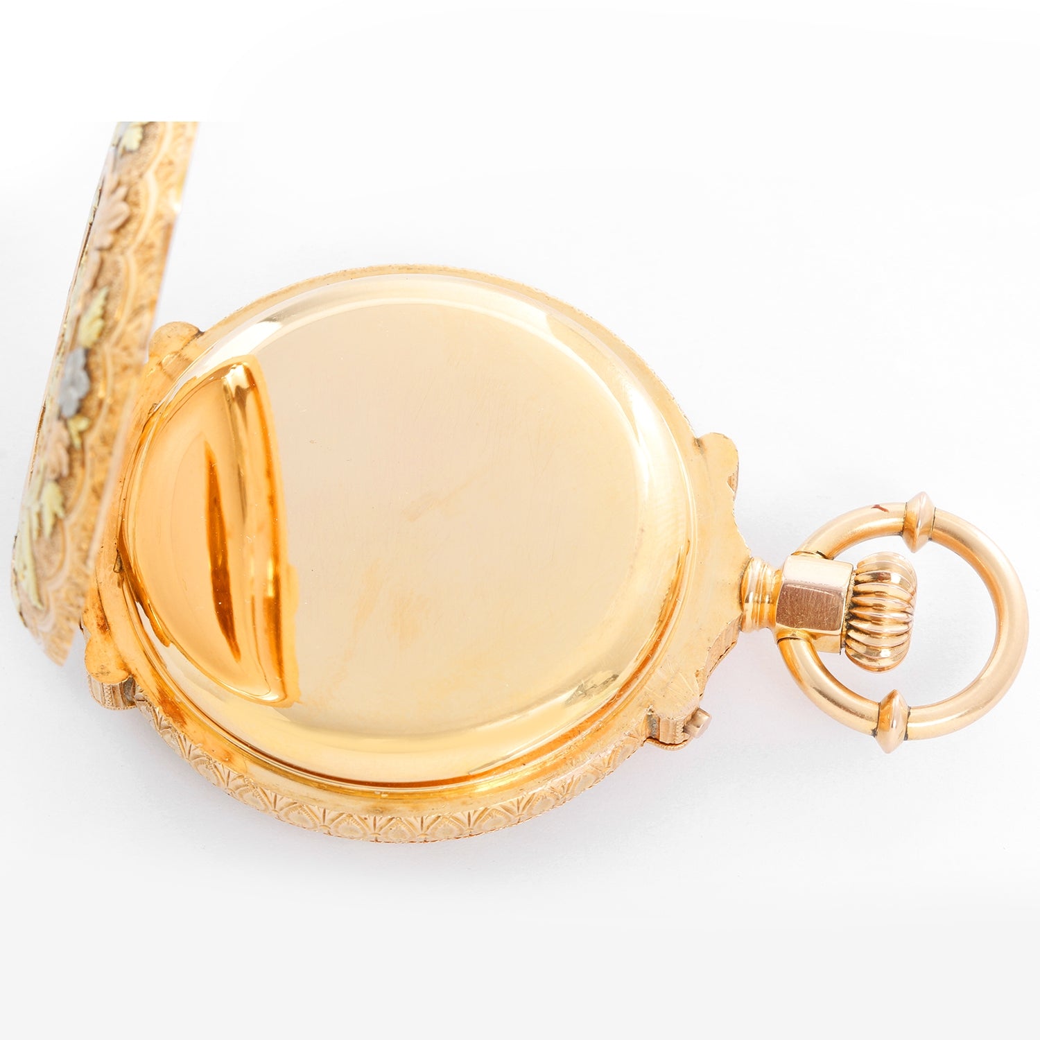 Extremely Rare, Large and Heavy Swiss Full Box Hinge Pocket Watch - Manual winding. Multi colored 18K Green gold, Rose gold, Yellow gold & White gold case, beautifully engraved (50 mm). Ornately engraved gold dial with center sweep hand . These watches were primarily made by American case makers for the American market. Swiss examples are extremely rare and collectible. Due to the complexity of applying the different gold color applications, most multicolored pocket watches were made in 14K. 18K examples are rare to find. The inside dust cover is signed R. F. and Peral Patent.