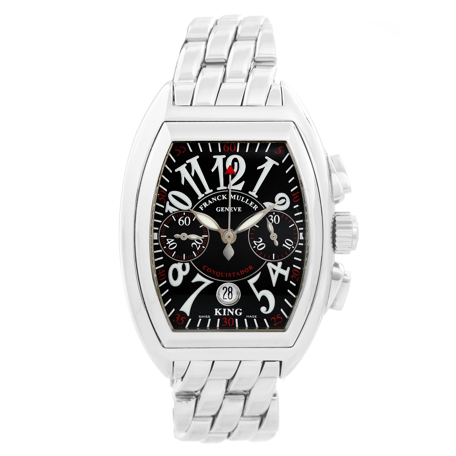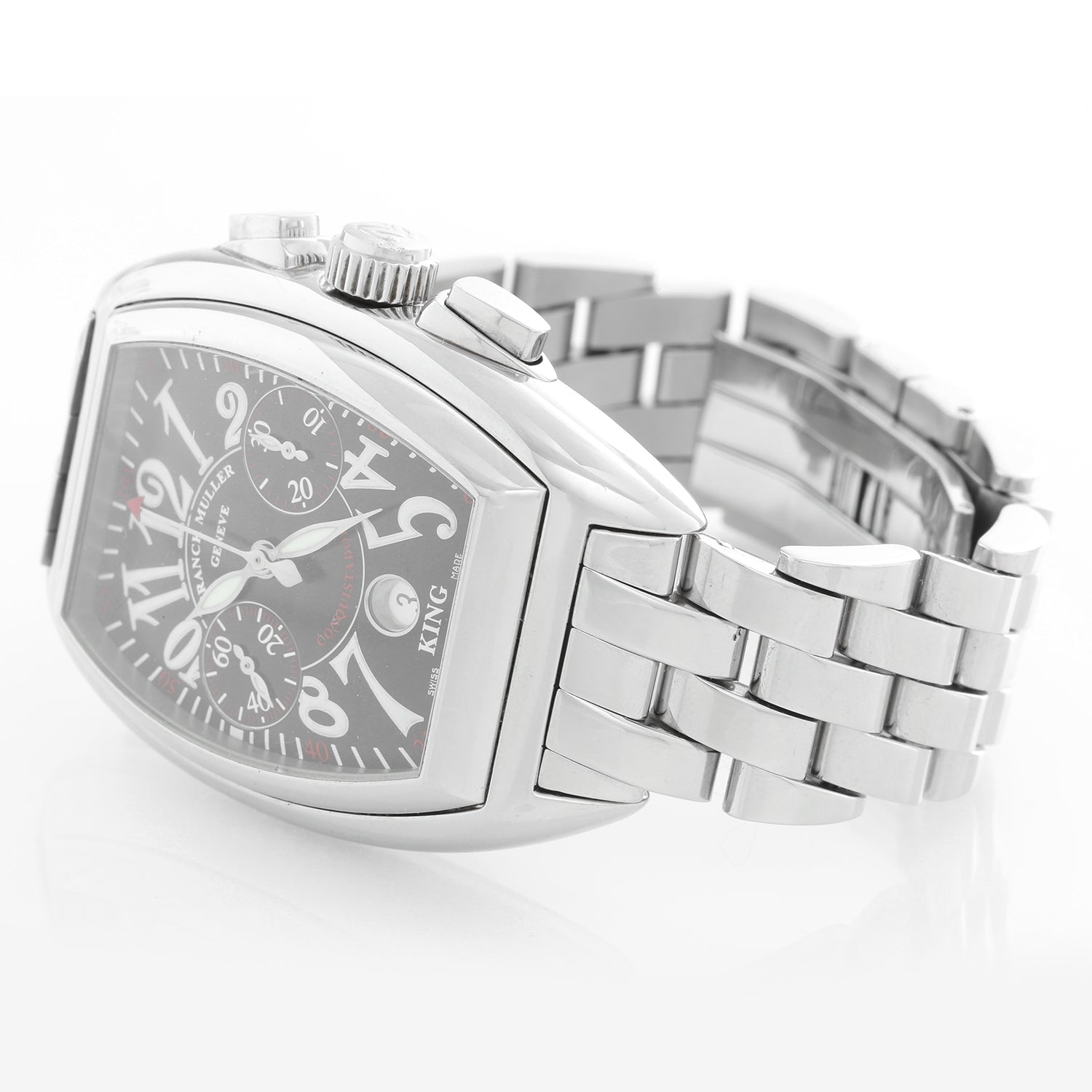 Franck Muller King Conquistador Men's Chronograph Stainless Steel Watch 8005KCC - Automatic winding. Stainless steel case (39mm x 56mm). Black dial with luminous style Arabic numerals; date at 6 o'clock. Stainless steel Franck Muller bracelet. Pre-owned with Franck Muller box .