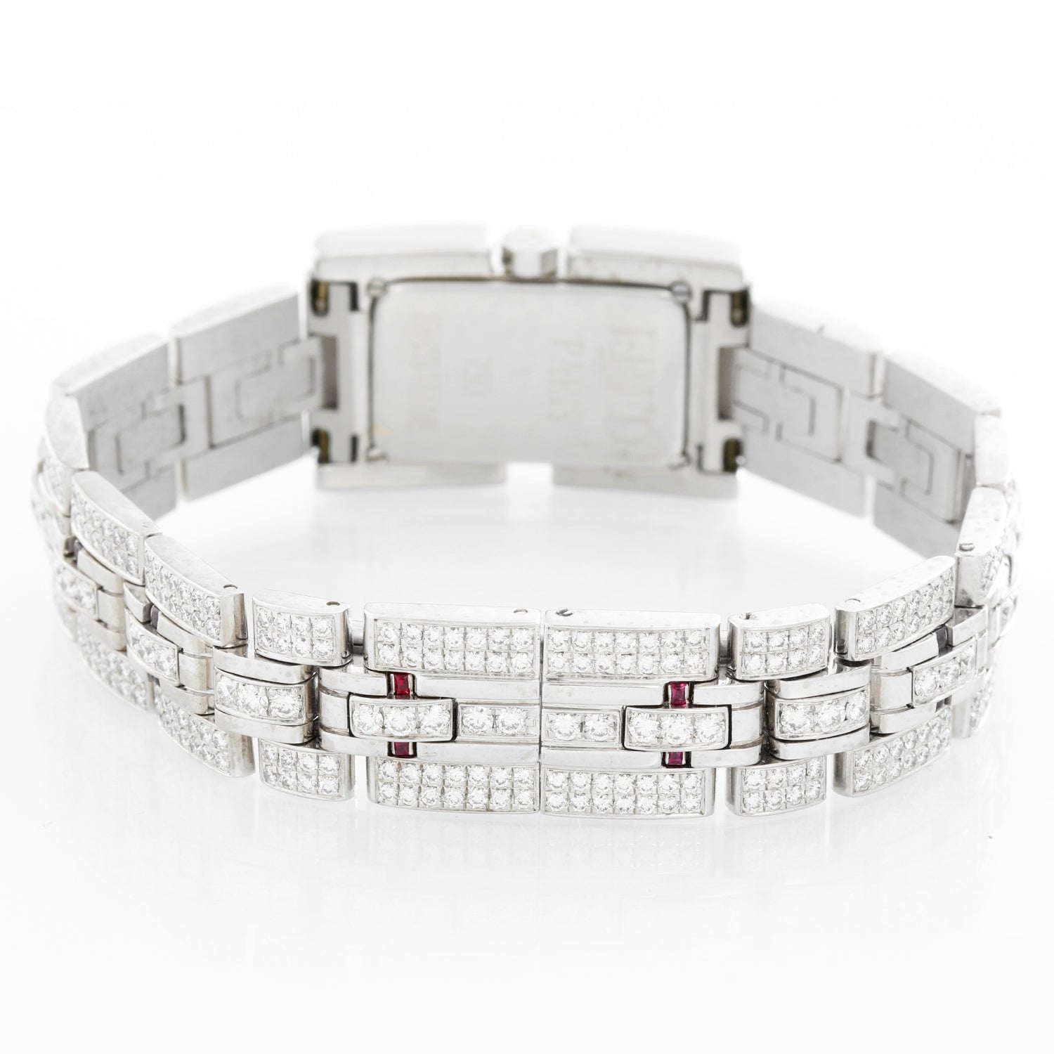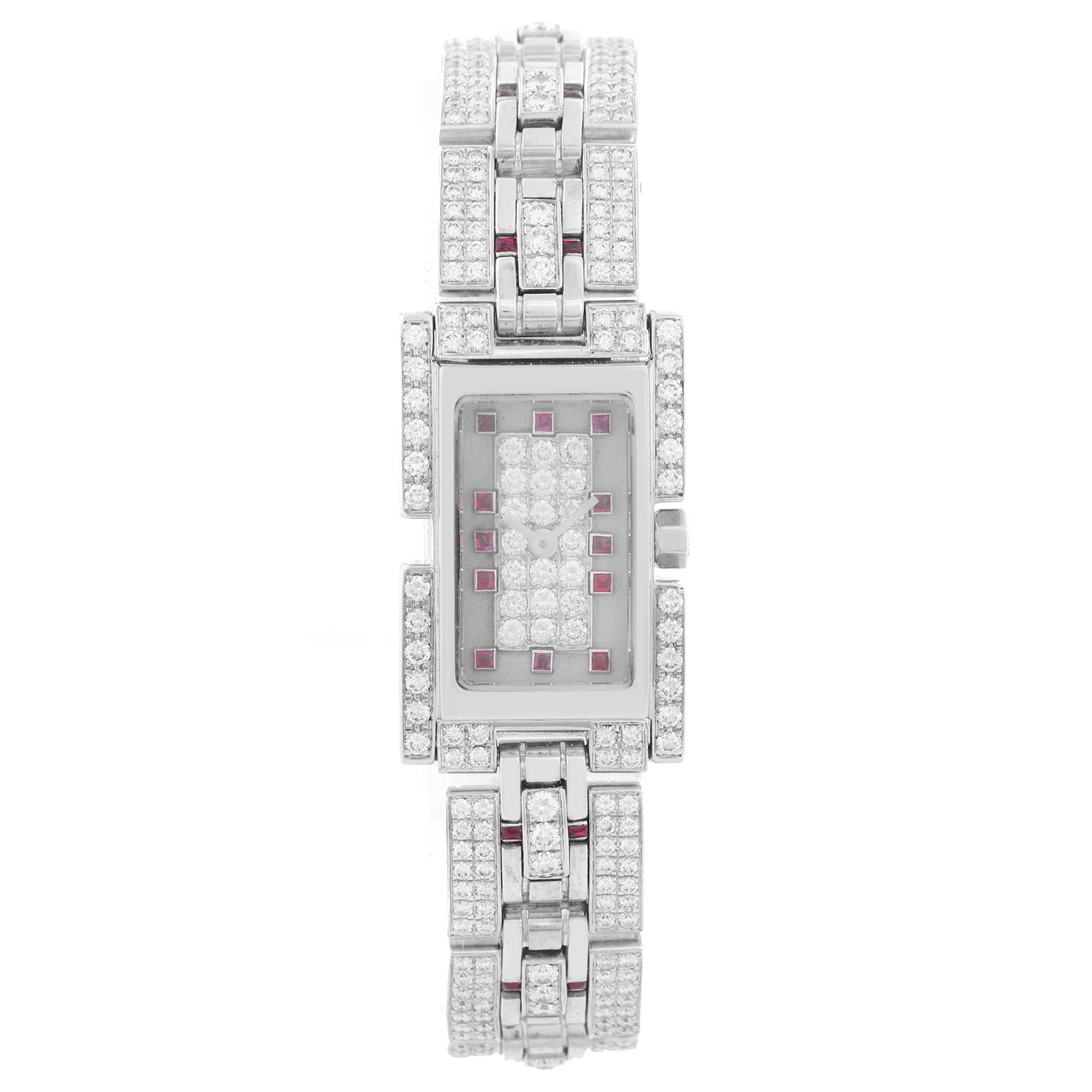 Fred of Paris 18K White Gold Pave Diamond Ladies Watch - Quartz. 18K White Gold with pave diamonds ( 28 x 18 mm ). Ivory dial with pave diamonds and rubies as hour markers. 18K White gold with diamonds and rubies; will fit up to a 6 1/2 inch wrist. Approx. 182 diamonds . Pre-owned with Fred box.