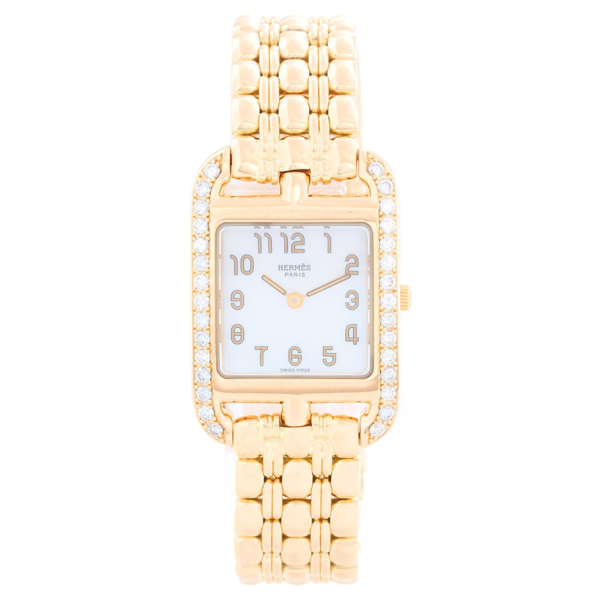 Hermes Cape Cod Yellow Gold Ladies Watch CC1.288 - Quartz. 18K Yellow gold ( 23 x 23 mm ) with diamond bezel. White mother of pearl watch with Arabic numerals. 18K Yellow gold Hermes bracelet; will fit 6 1/4 inch wrist . Pre-owned with Hermes box and papers.