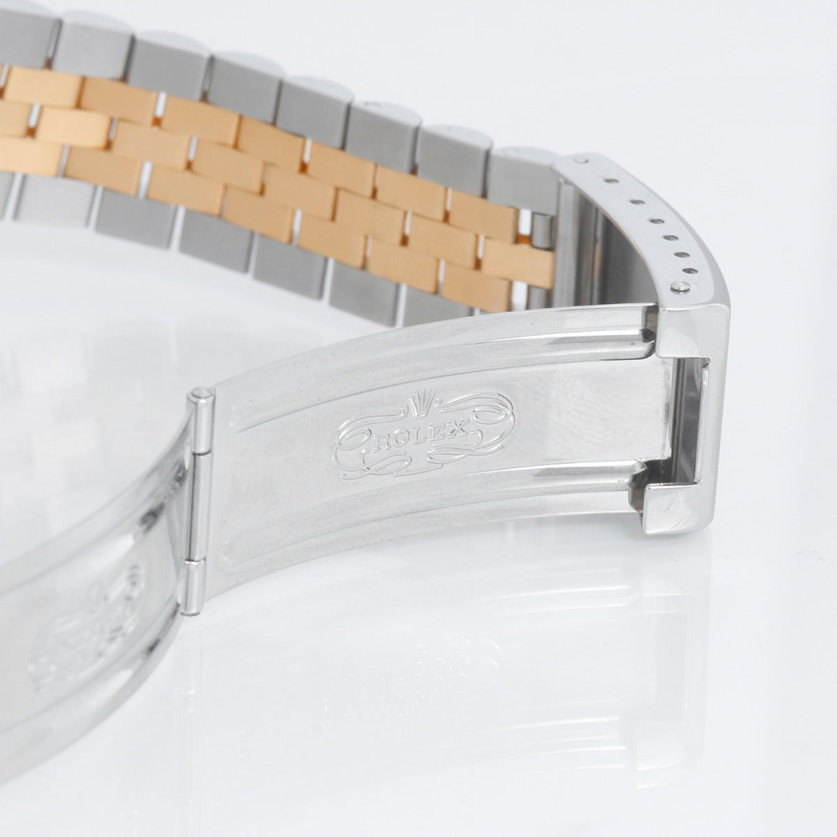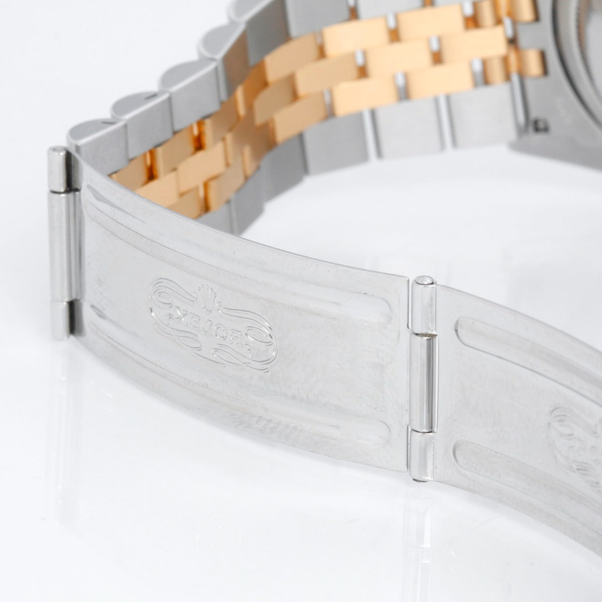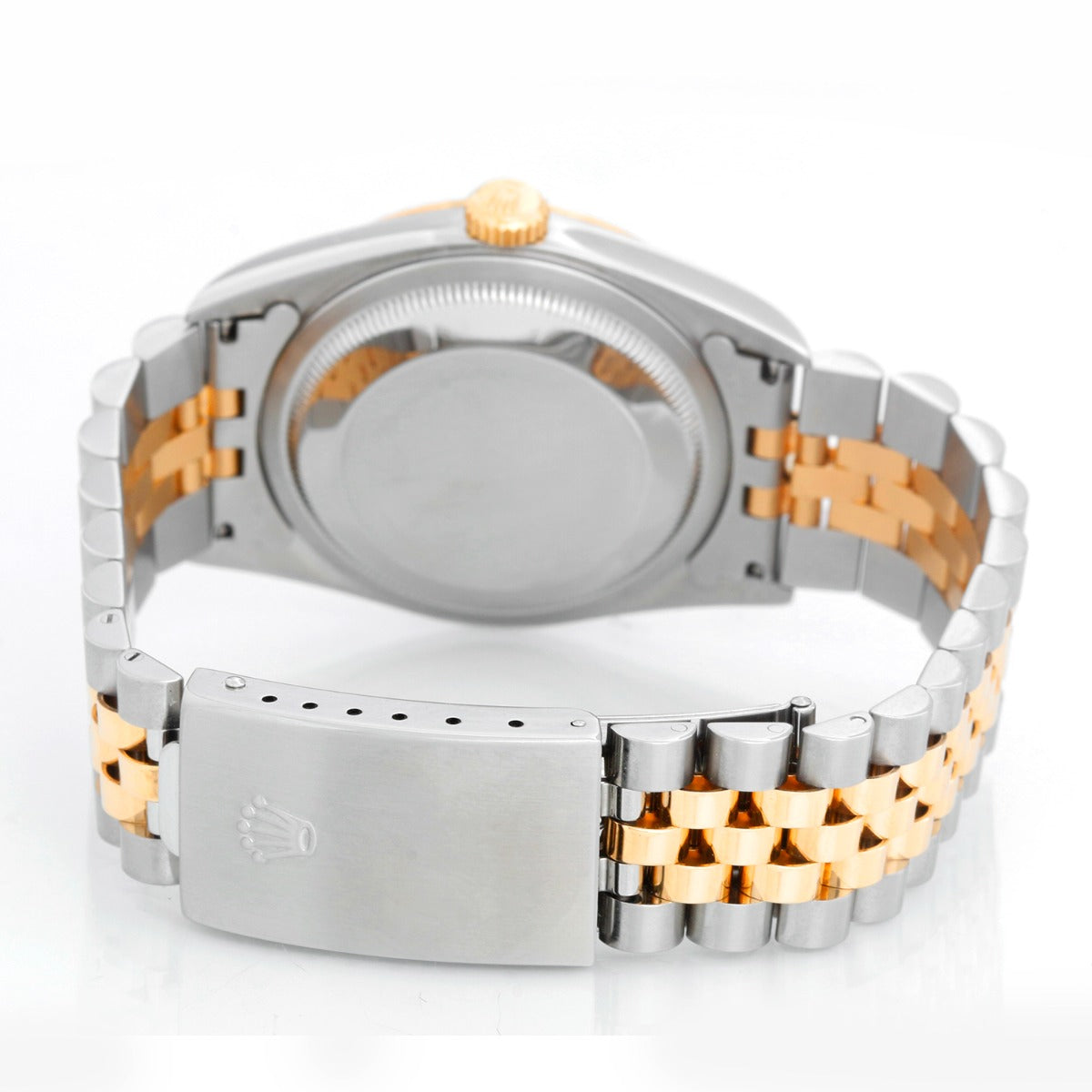 Rolex Datejust - Model 16233 - Men's automatic winding wristwatch. Stainless steel case with 18k yellow gold fluted bezel (36mm diameter). Sapphire crystal. Blue dial with gold stick markers. Stainless steel and 18k yellow gold Jubilee bracelet. Pre-owned with custom box.