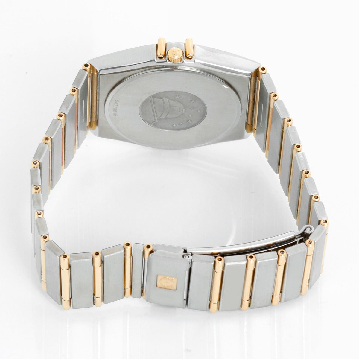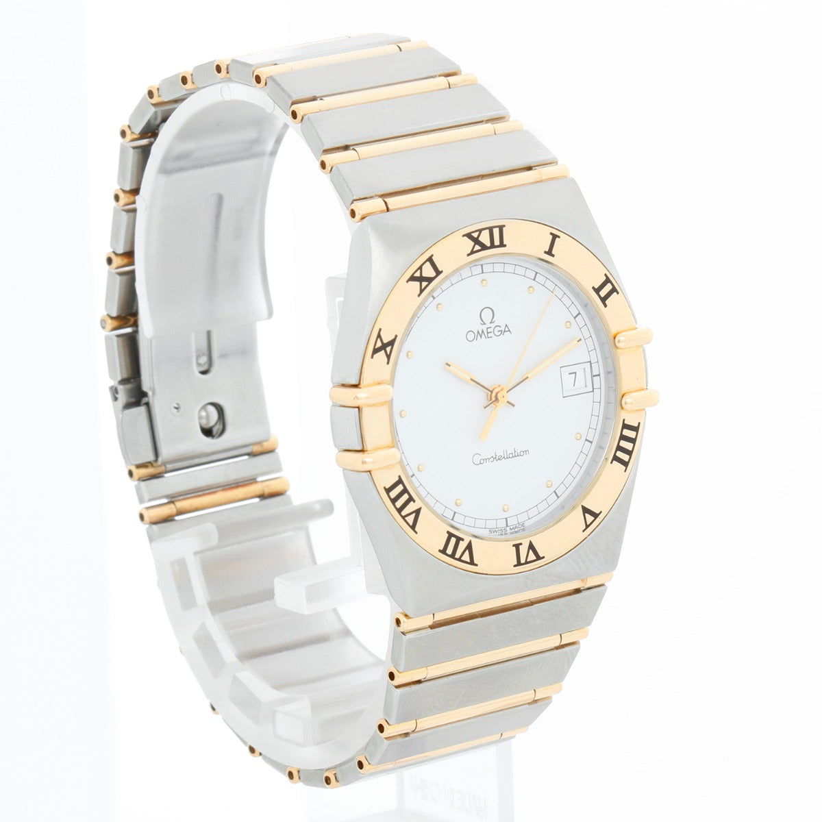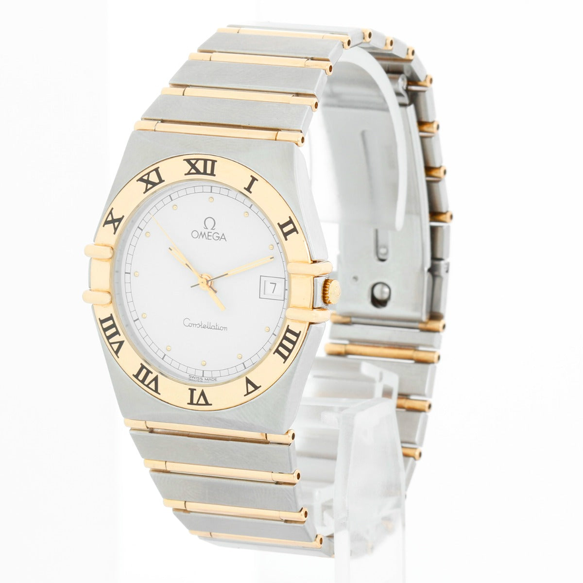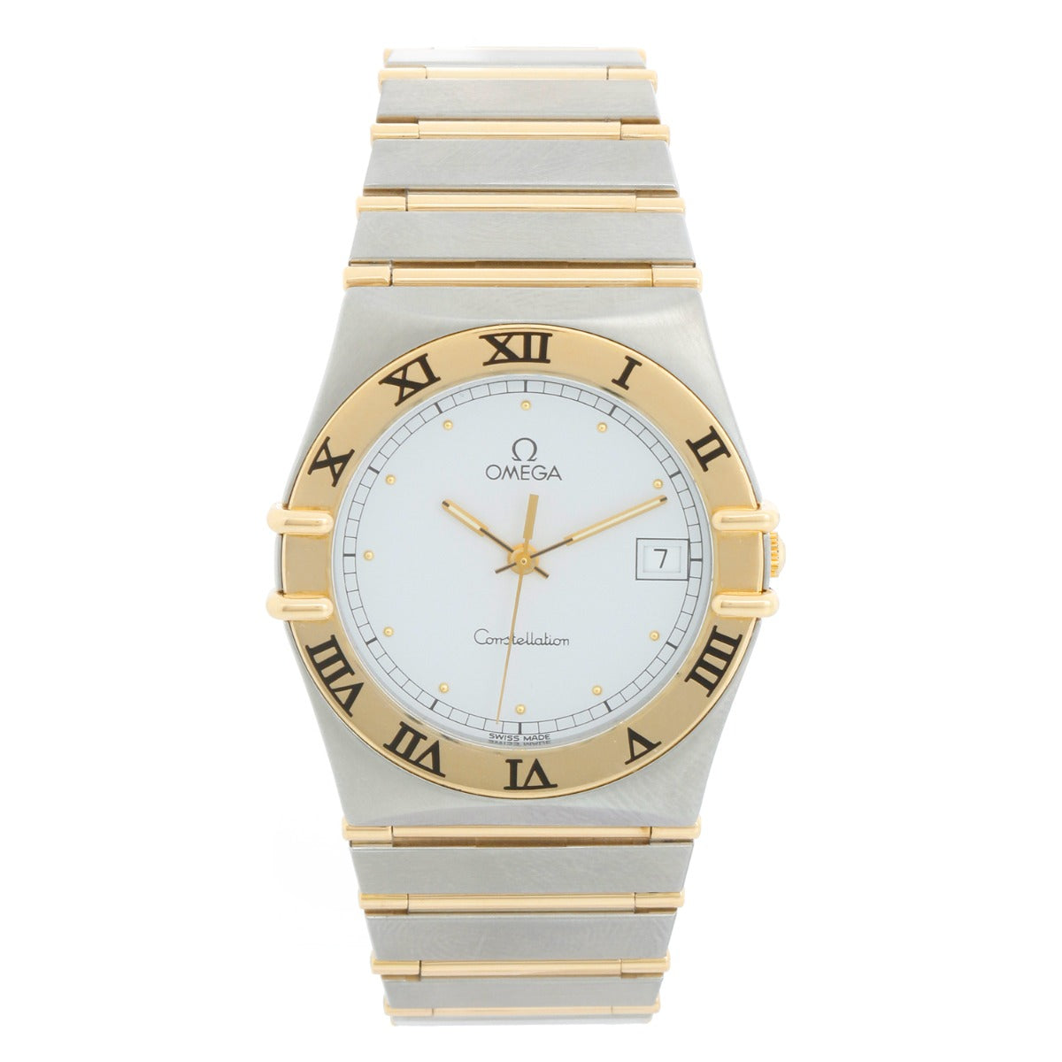 Omega Constellation 2-Tone Men's Quartz Watch - Quartz. Stainless steel with 18K yellow gold fixed bezel (33mm). White dial with luminous hands; date at 3 o'clock. Stainless steel deployment buckle clasp; will fit a 7.5 inch wrist . Pre-owned with custom box.