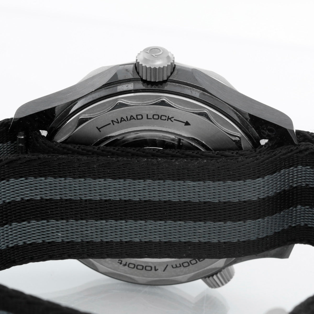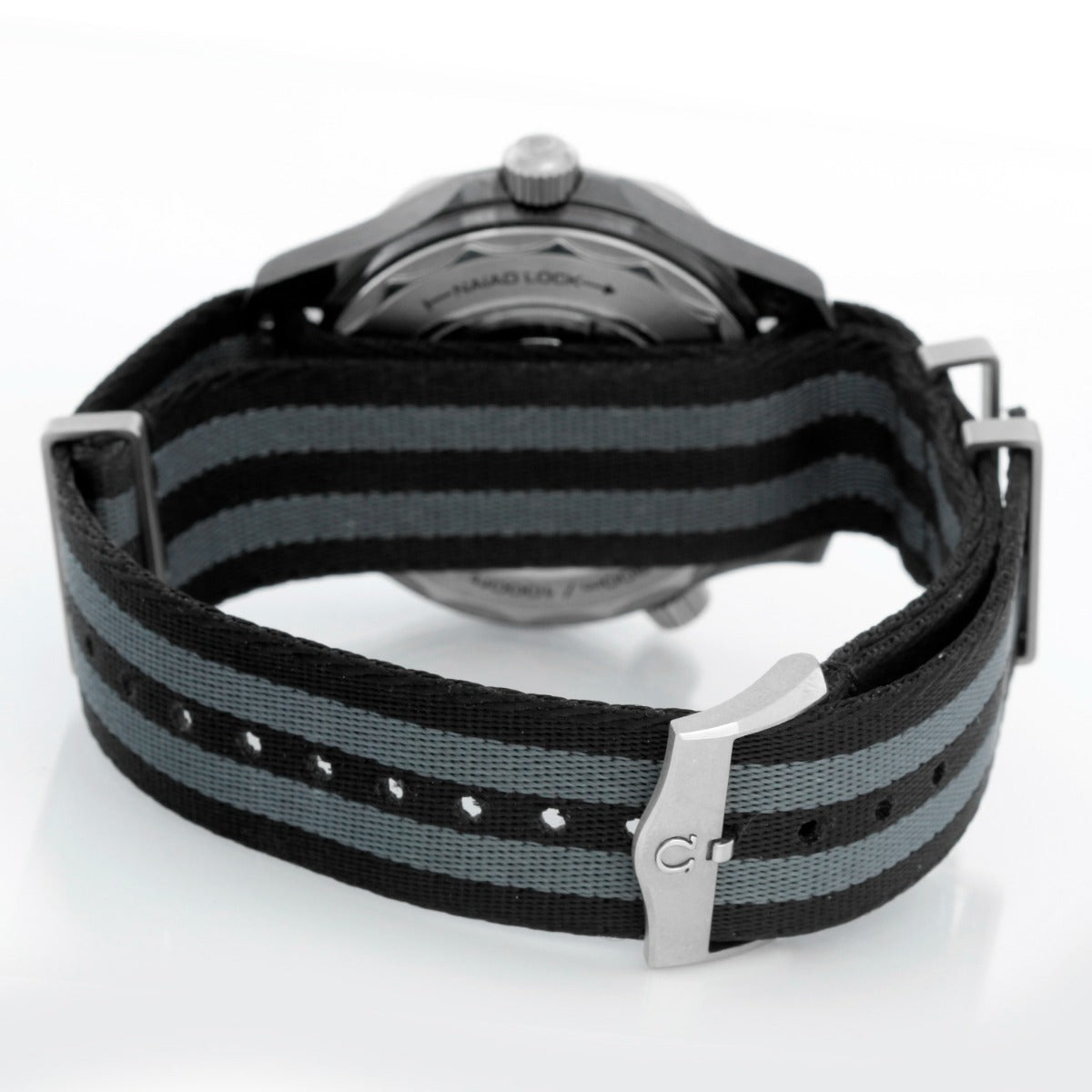 Omega Seamaster Diver 300 M Co-Axial Master Chronometer 210.92.44.20.01.002 - Automatic winding. Black Ceramic with Grade 5 Titanium Case (43mm). Black wave dial with luminous markers. Black & Grey 5-stripe Nato Strap with Omega titanium buckle. Pre-owned with Omega box and papers.