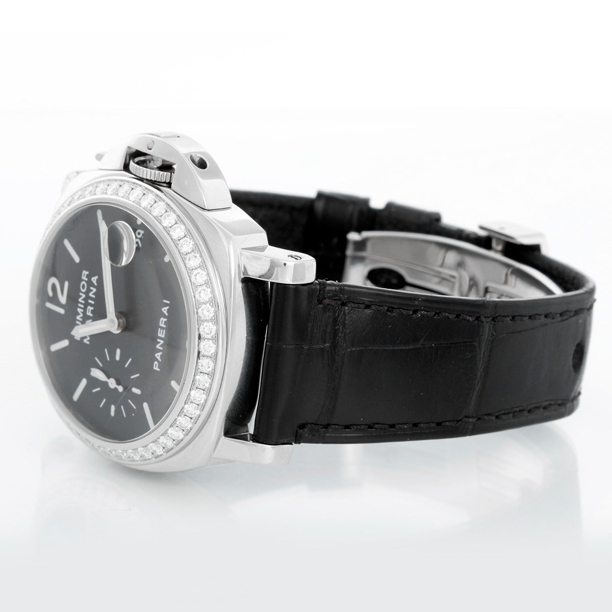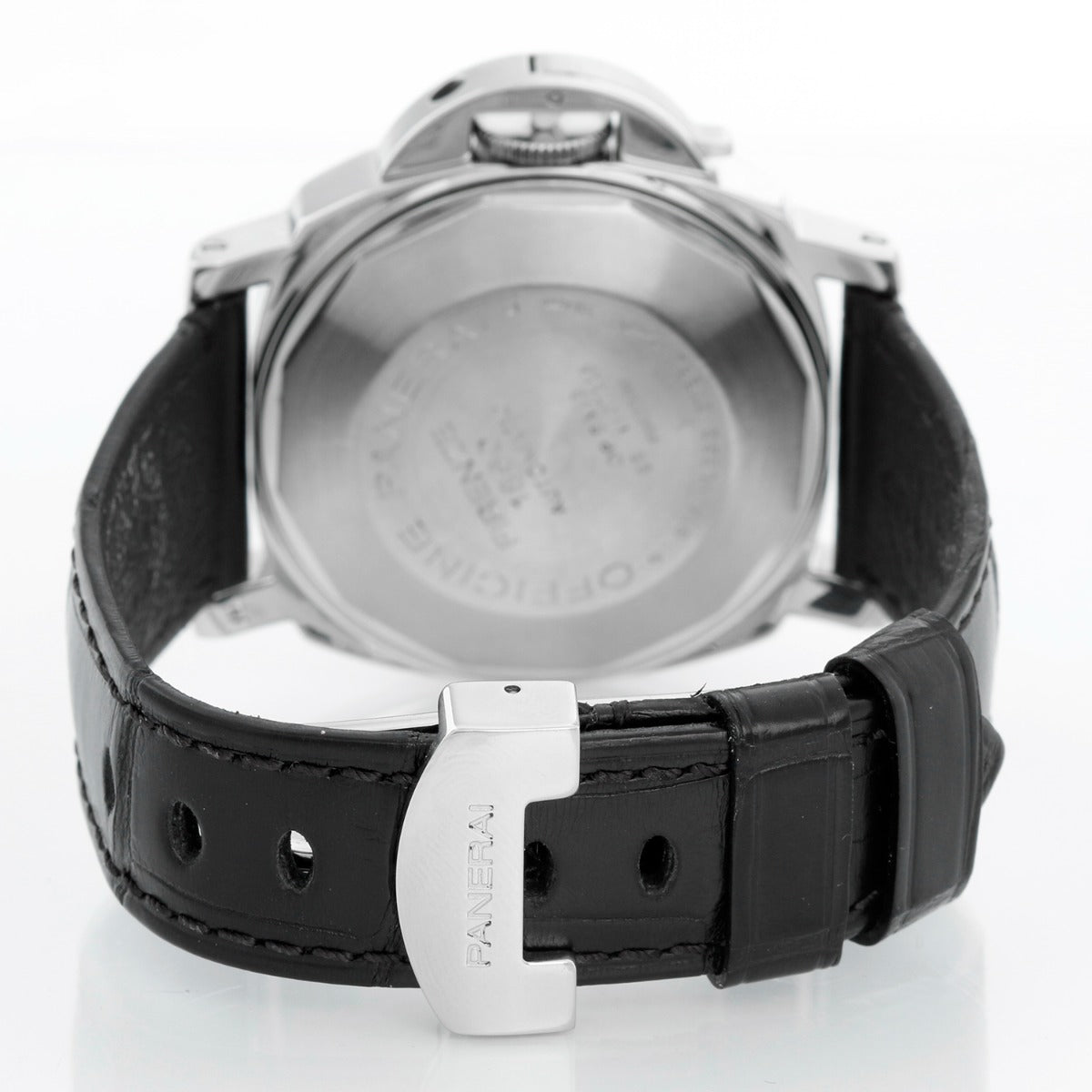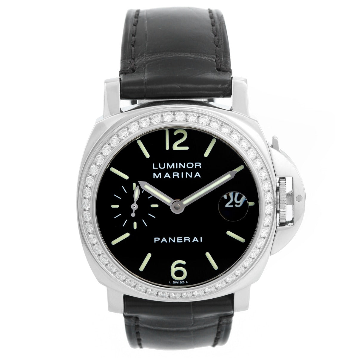 Panerai Luminor Marina Stainless Steel Watch PAM 00071 - Automatic winding with date. Stainless steel case with Panerai diamond bezel ( 40 mm ). Black dial with luminous style Arabic numerals and stick markers; subseconds at 9 o'clock. Panerai Leather Strap with signed deployant buckle. Pre-owned with Panerai box and papers. Limited edition 7/100.