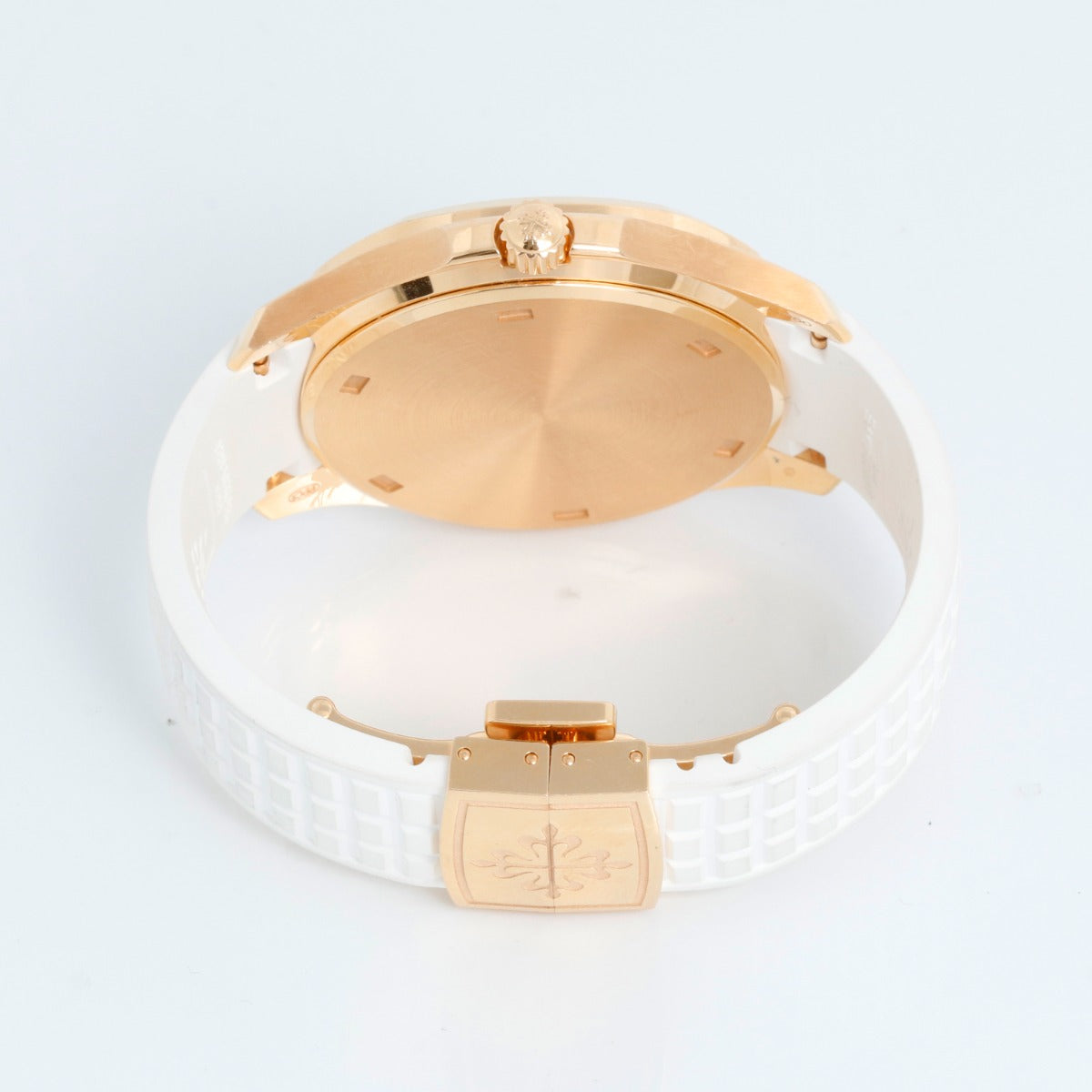 Patek Philippe Aquanaut 18K Rose Gold Travel Time Ref 5269R - Automatic winding. 18K Rose gold cushion shaped case (39 mm). White Waffle pattern dial with rose gold Arabic numerals. White rubber strap with 18K Rose gold Patek Philippe deployant clasp. Pre-owned with Patek Philippe box