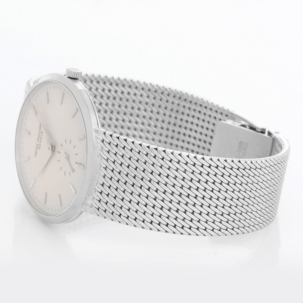 Patek Philippe Calatrava Men's 18k White Gold Watch. Ref. 3893 - Manual winding. 18k white gold case (33mm diameter). Enamel ivory colored dial with gold stick markers; subseconds dial at 6 o'clock position. Integrated 18k yellow gold bracelet. Fits 6 3/4'' wrist. Pre-owned with Patek Philippe box .