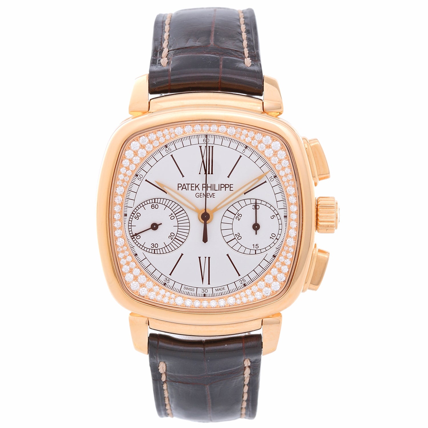 Patek Philippe & Co. Ladies Chronograph Ref 7071 R-001 - Manual winding. 18K Rose gold (39 x 35 mm ). Opaline dial surrounded by 116 diamonds weighing .55 cts ; sub dial at 3 o'clock and 6 o'clock. Leather strap with 18K rose gold buckle. Pre-owned with Patek Philippe box and papers.