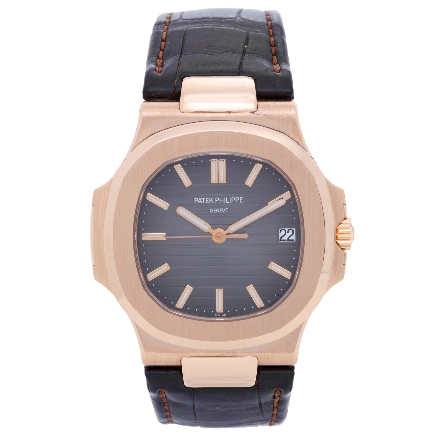 Patek Philippe & Co. Nautilus Men's 18k Rose Gold Watch 5711R-001 - Automatic winding. 18k rose gold case (43mm) (43mm diameter). Brown dial. Leather strap band with 18k rose gold deployant clasp. Pre-owned with box and papers.
