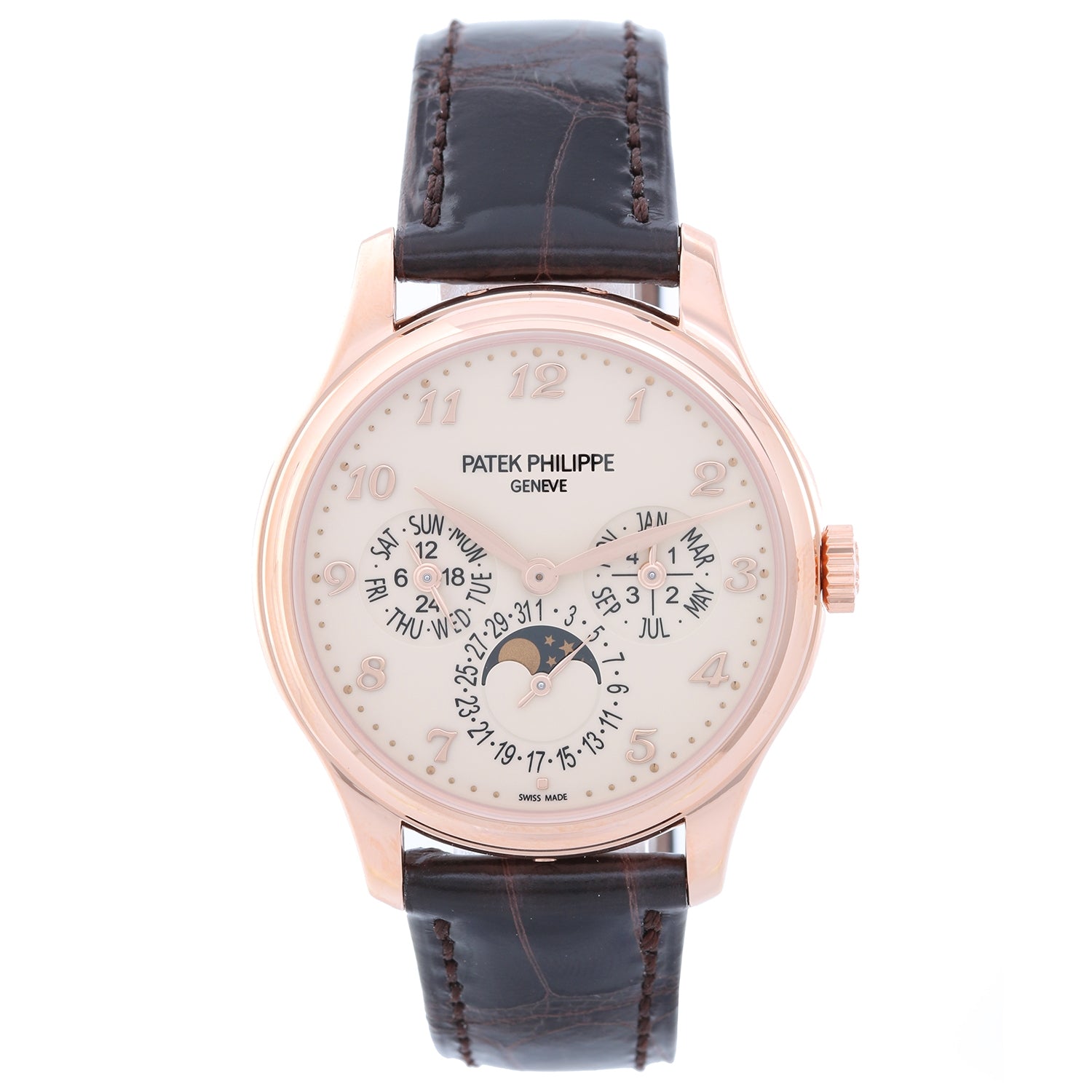 Patek Philippe Grand Complication Perpetual Calendar Moonphase 5327R-001 - Rose gold case with sapphire crystal, cream color dial with Arabic numerals. Strap is brown alligator with rose gold deployant clasp. Pre-owned with Patek box and papers.