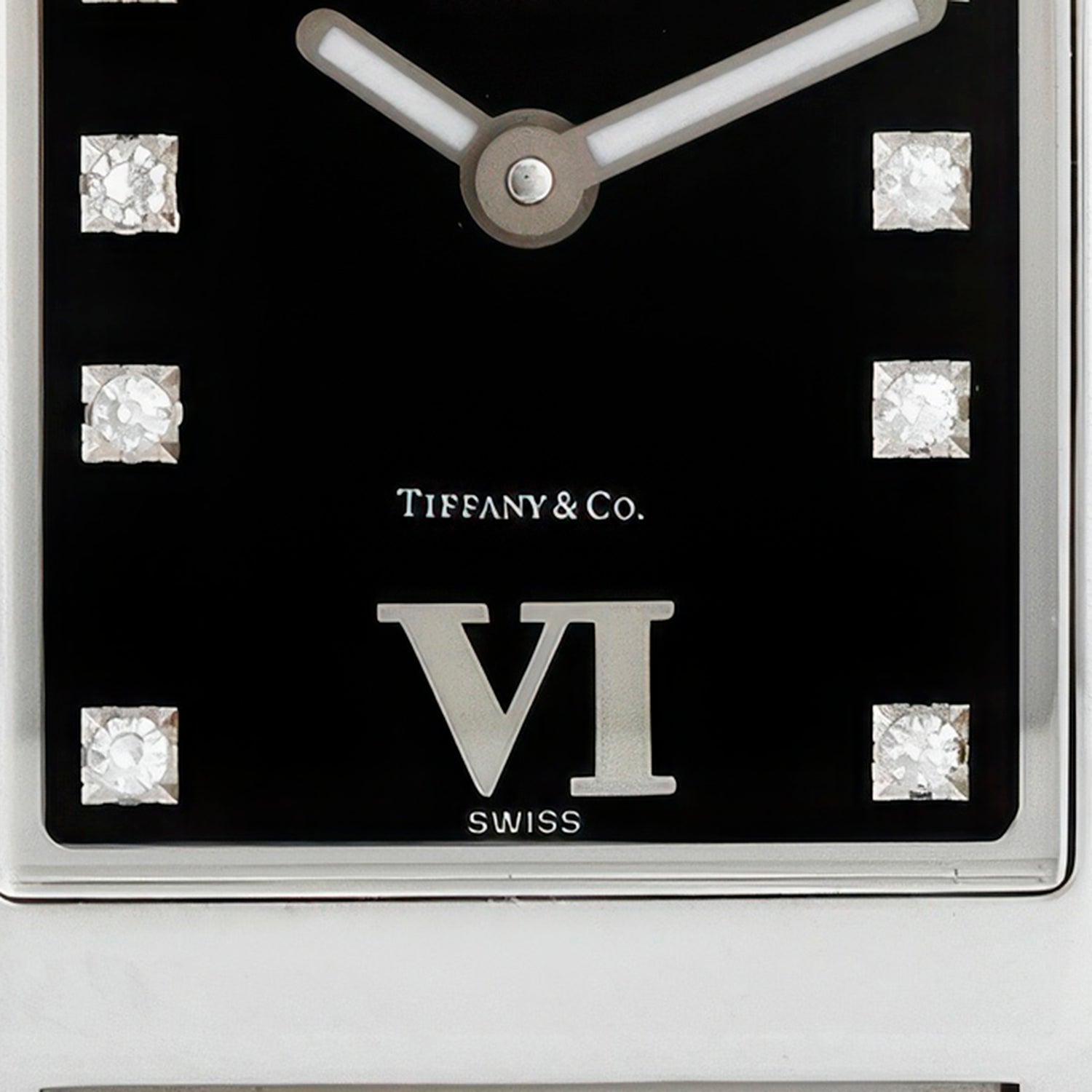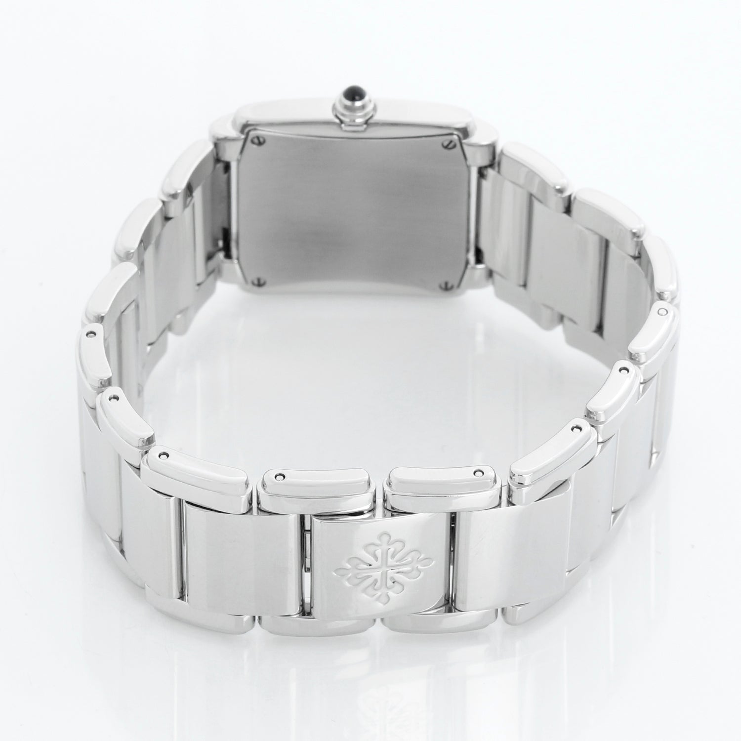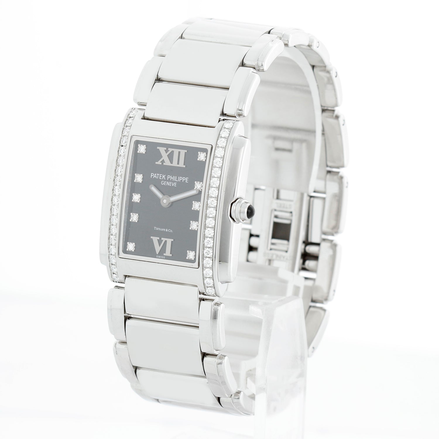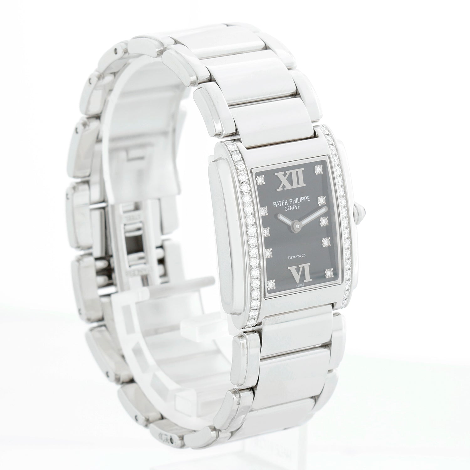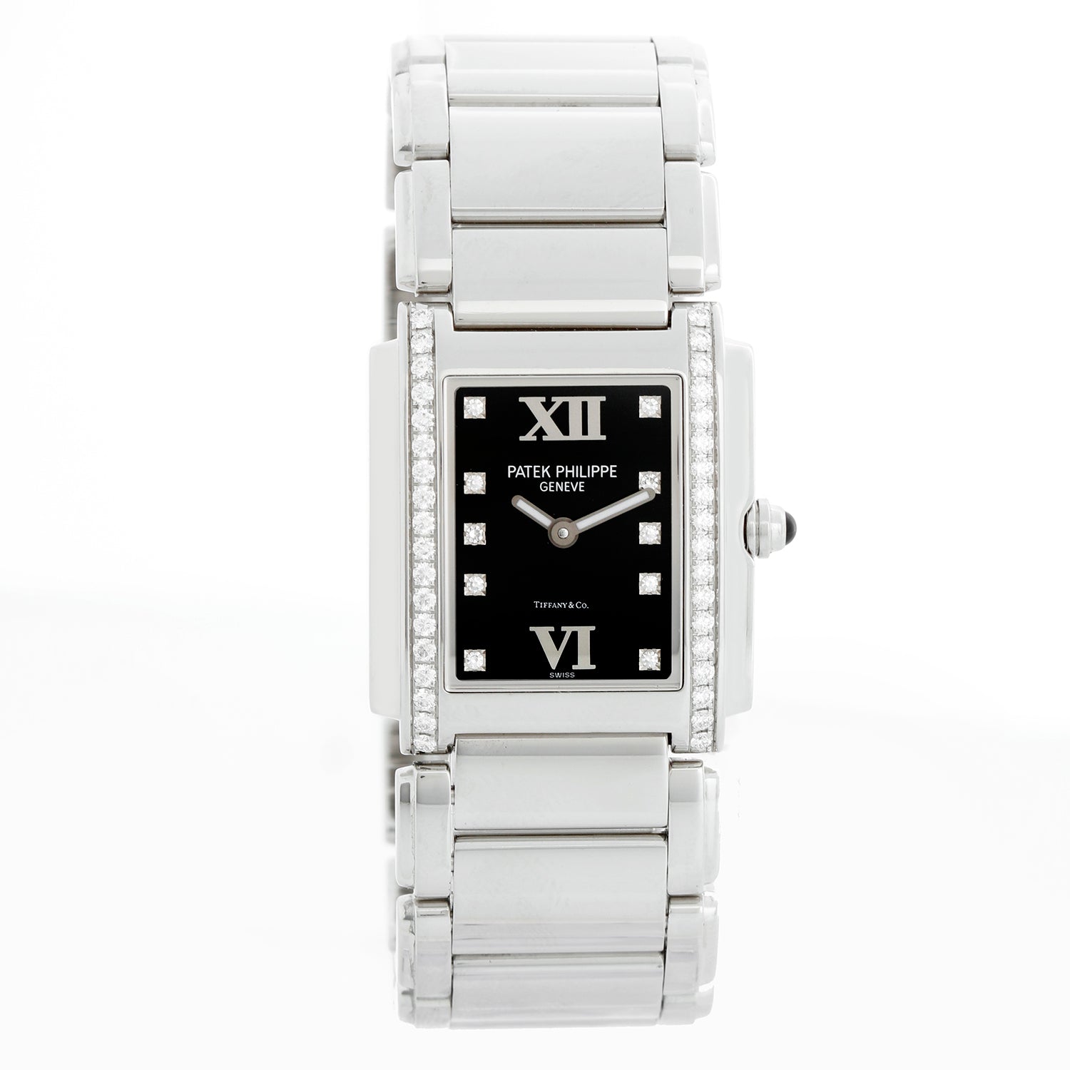 Patek Philippe Tiffany Twenty-4 Ladies Steel & Diamond Watch 4910/10A - Quartz. Twenty-4. Stainless steel case; bezel set with 36 diamonds (25mm x 30mm). Black dial with diamond markers and Roman numerals; Dial signed Tiffany & Co.. Stainless steel Patek Philippe bracelet. Pre-owned with Patek Philippe Travel box & copy of original papers . Dated 2014.