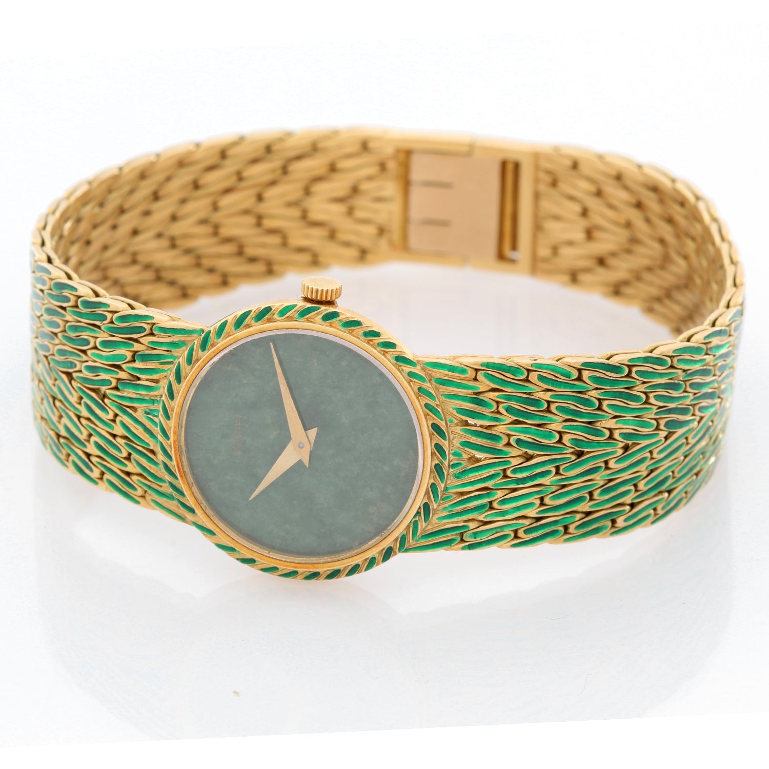 Piaget Dancer Vintage Dress Jade Watch - Manual winding. 18K Yellow Gold ( 24 mm ). Jade. 18K Yellow Gold peacock link bracelet. Pre-owned with custom box. Wrist size 6.75 inch. Total weight 58.8 grams.