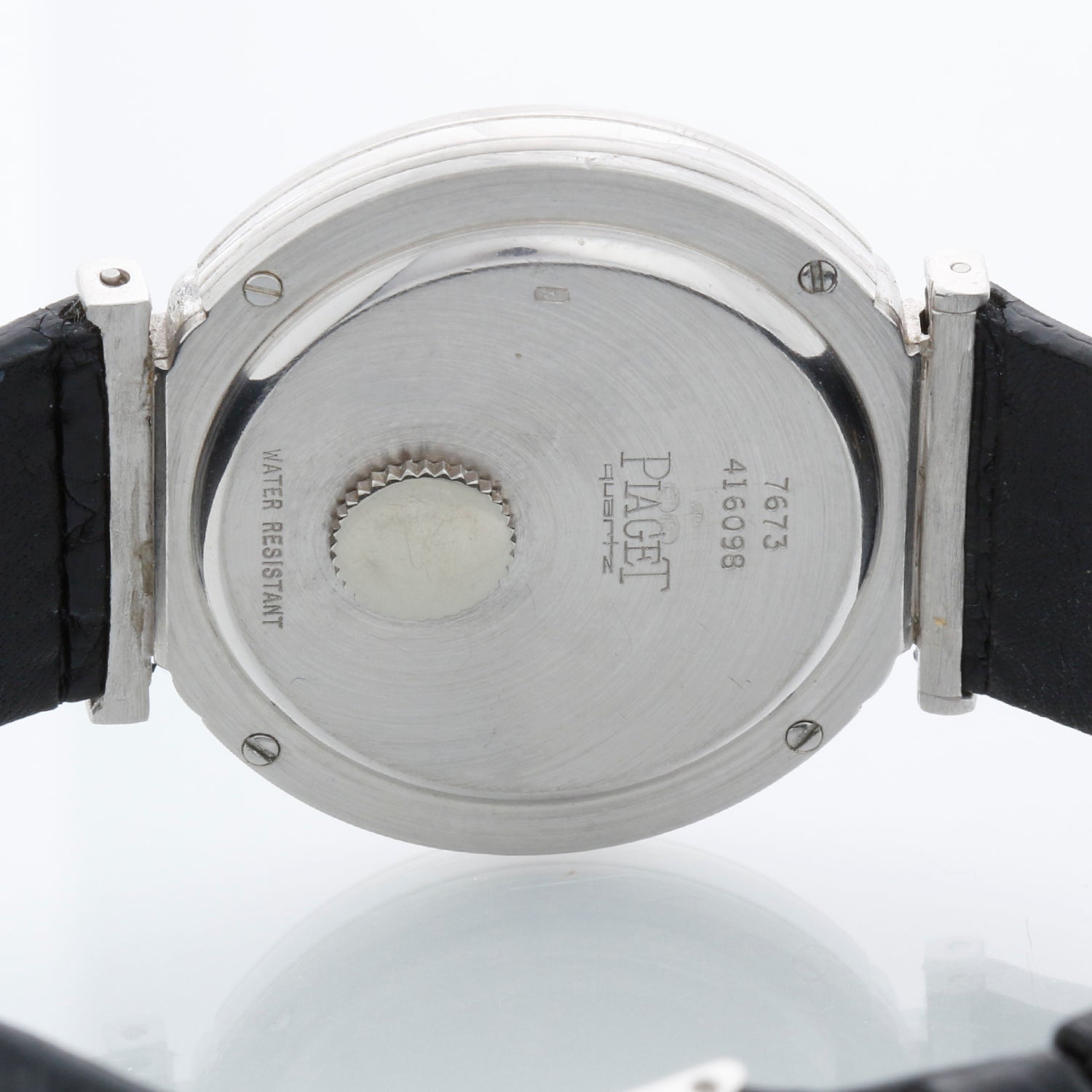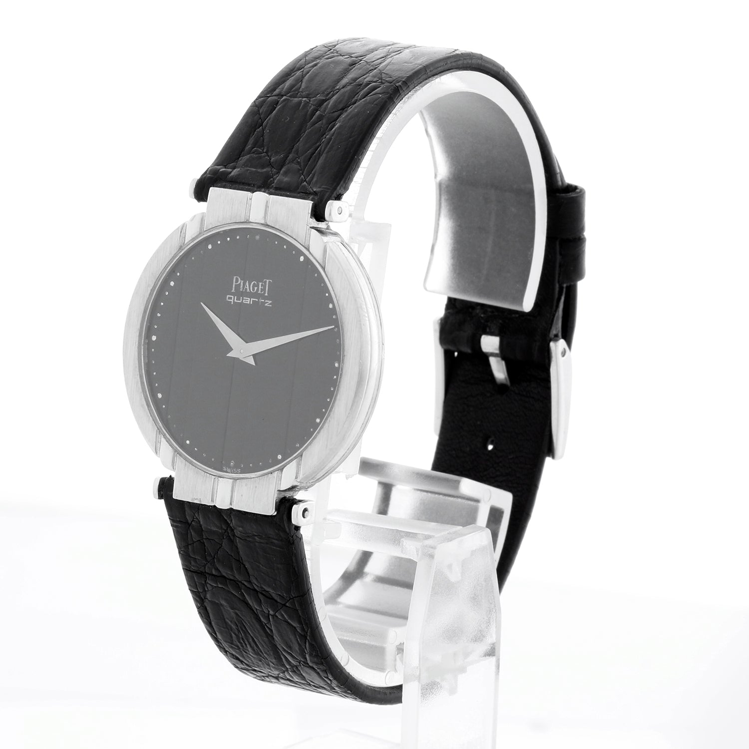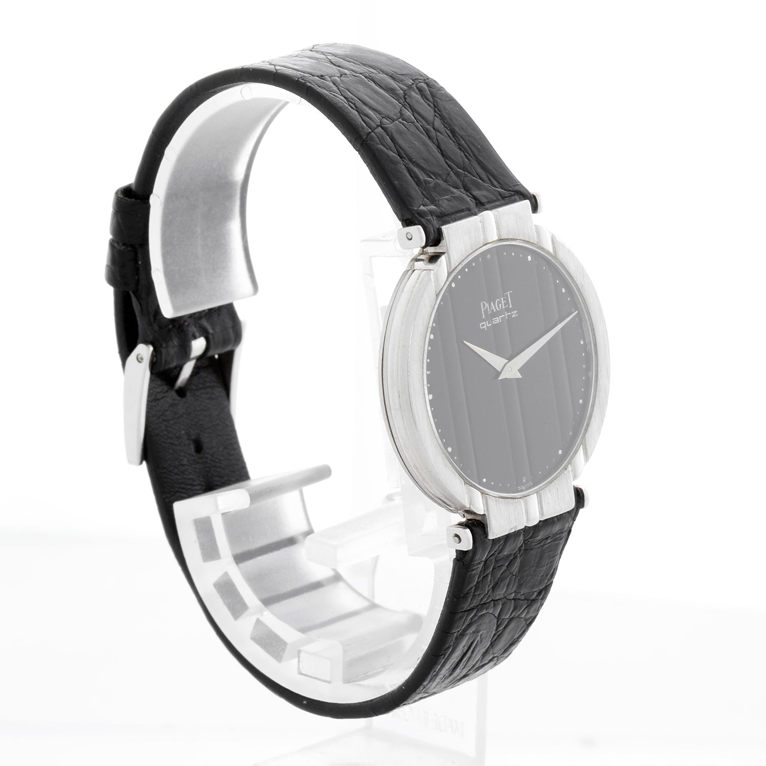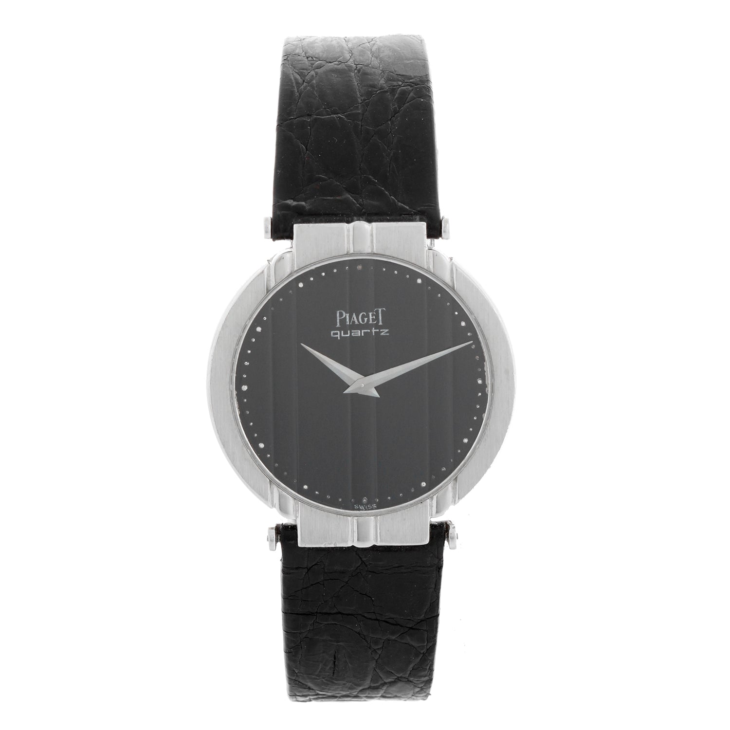 Piaget White Gold Men's Polo Dress Watch Ref. 7673 - Quartz. POLO. 18k white gold case (32mm). Black dial. Black Piaget strap with Piaget buckle. Pre-owned with custom box.