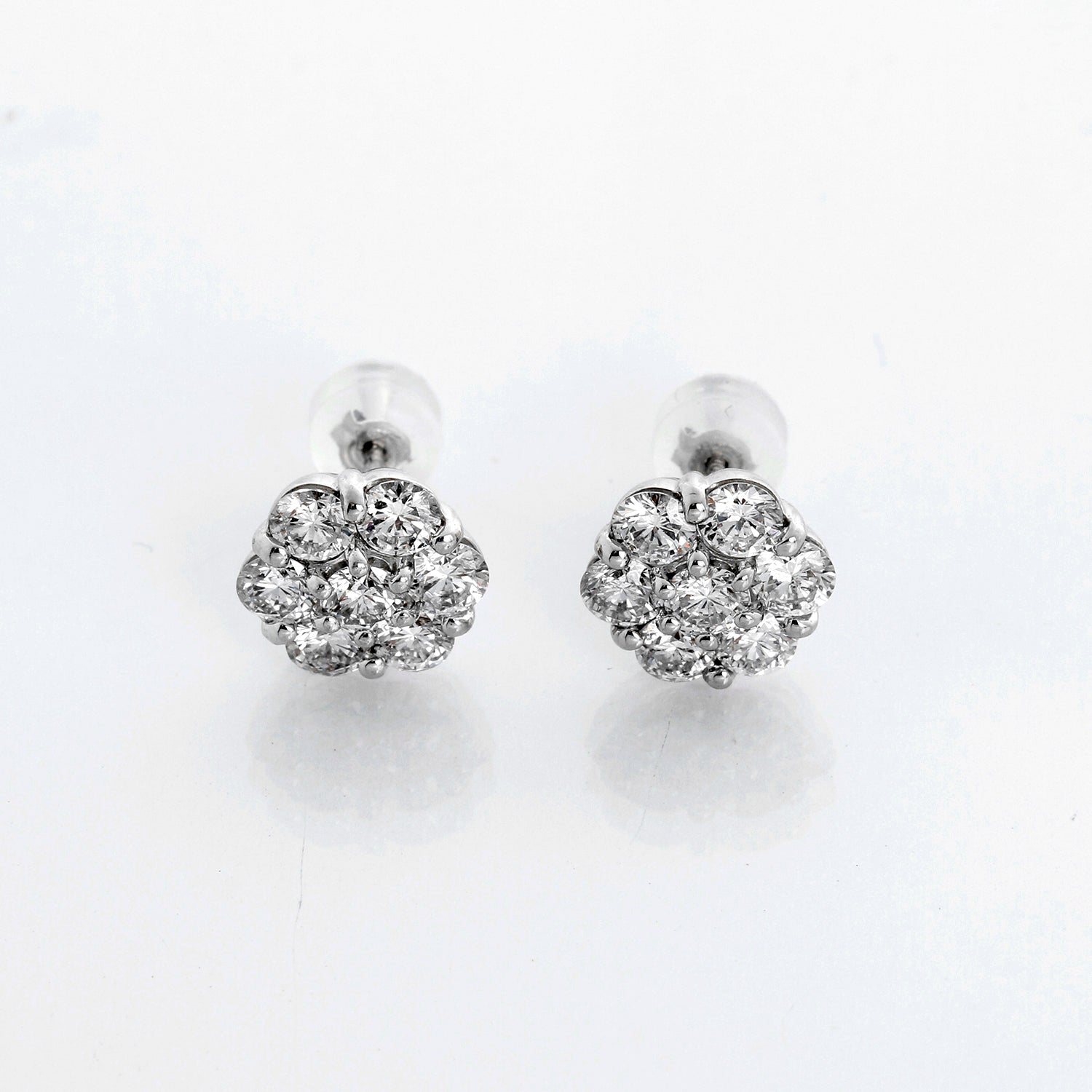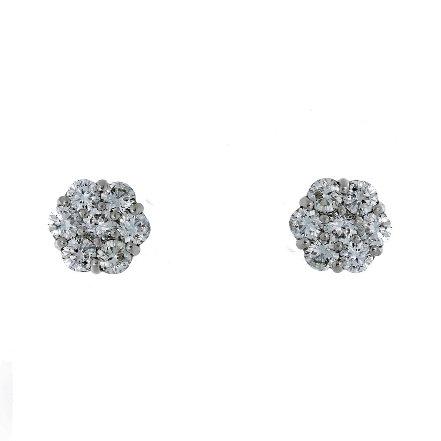 Platinum Diamond Flower Studs – 2 cts. Total Weight - These Platinum Diamond Flower Studs showcase timeless beauty with seven brilliant diamonds arranged in a stunning floral pattern. With a total diamond weight of 2 carats, these studs offer exceptional sparkle and brilliance. The diamonds are set in platinum with F-G color and VS clarity, ensuring a refined look. With a width of .35 inches and a total weight of 4.6 grams, these studs provide the perfect balance of sophistication and grace. A flawless addition to any fine jewelry collection..
