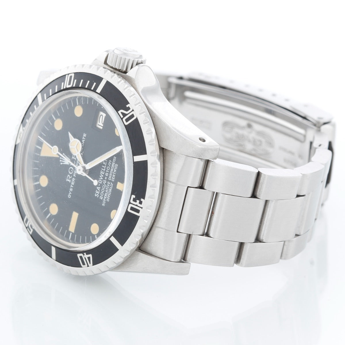 Rare Collectible Vintage Rolex Sea Dweller Men's Steel Watch 1665 " Great White" - Automatic winding with date; acrylic crystal. Stainless steel case with helium escape valve (40mm diameter). MKII " Rail" dial. Stainless steel oyster bracelet with flip-lock clasp. Pre-owned with Rolex box- Circa 1979. This is the rarest and most beautiful dial of the "Great Whites". It was only made for a short time period.