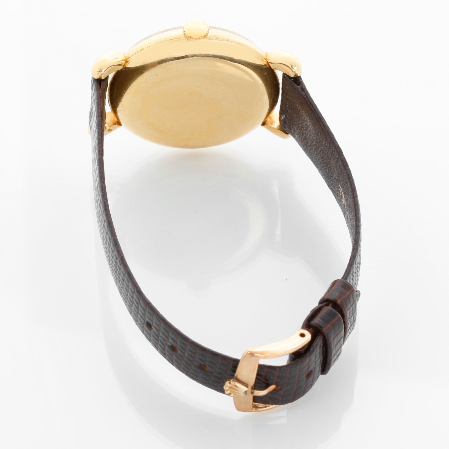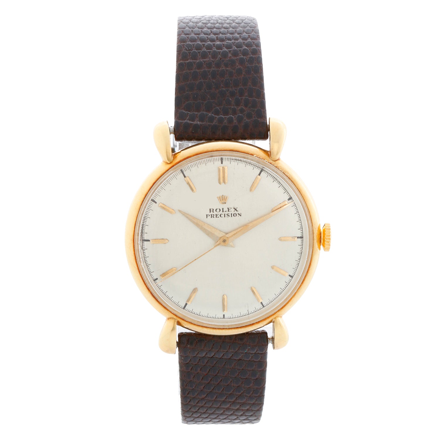Rolex 18K Yellow Gold Precision Model Ref. 4411 Men's Dress Watch - Manual winding. 18K Yellow gold case with teardrop lugs ( 34 mm ). Refurbished Silver Dial with raised gold hour markers. Brown Rolex strap band with Rolex buckle. Pre-owned with DeMesy box.