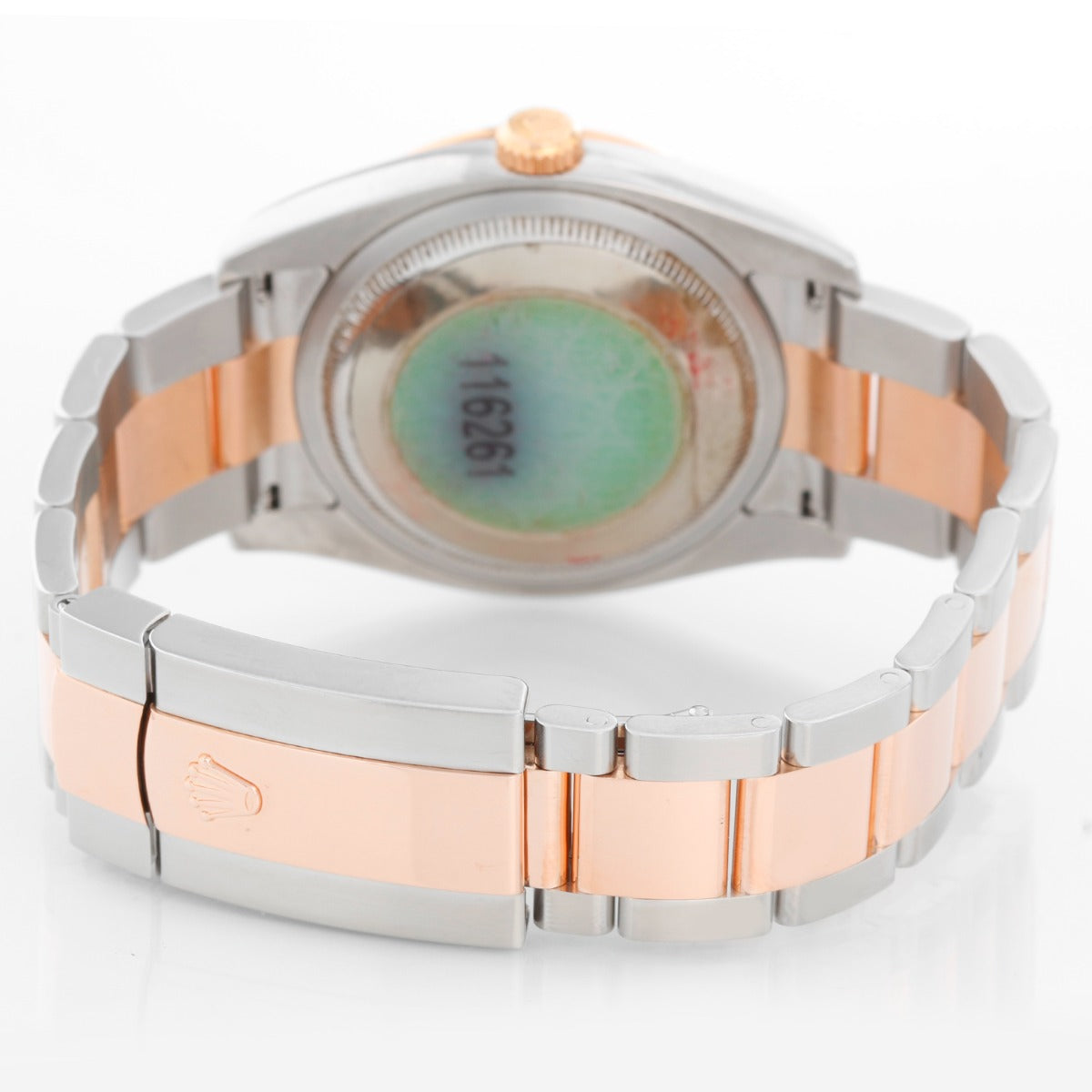 Rolex 2-Tone Turnograph Men's Steel & Rose Gold Watch 116261 - Automatic winding with date; sapphire crystal; 31 jewels. Stainless steel case with 18k rose gold rotating Thunderbird bezel (36mm diameter). Black dial with gold stick markers. 2-Tone Rolex Rose Gold and Stainless Steel Oyster Bracelet. Pre-owned with custom box.